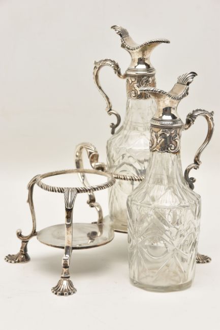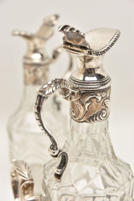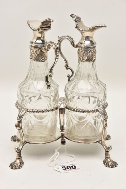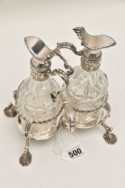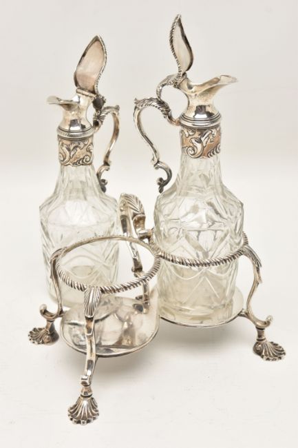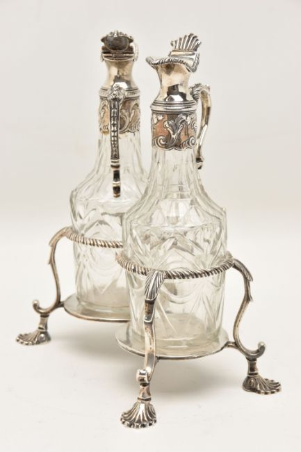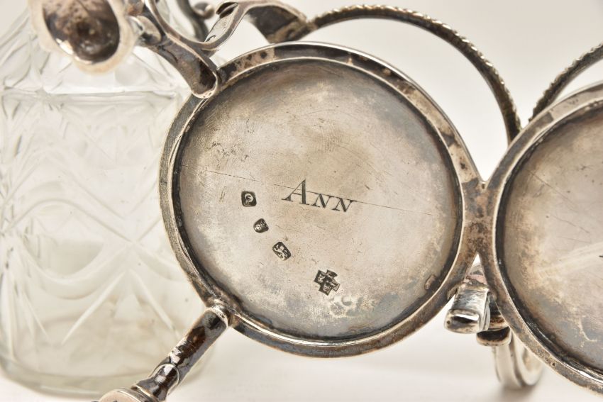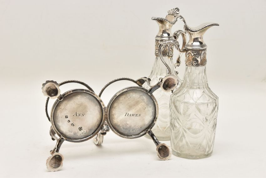 A GEORGE III SILVER TWO BOTTLE OIL AND VINEGAR BOTTLE CRUET BY JABEZ DANIELL AND JAMES MINCE, the stand with a gadrooned gallery, foliate scrolled handle and shell cast feet, engraved to the underside 'ANN DAWES', with one word to each of the bases, the clear glass facet cut bottles with hinged covers, repousse foliate mounts to the necks and foliate scroll handles, bearing lion passant marks only, which are contemporary to the stand, cruet frame Jabez Daniell & James Mince, London 1770, weight of frame 11.08ozt, 344.5 grams, height 21.5cm, gross weight including bottles 1083 grams (Condition Report: in good condition overall, sits level on a flat surface, glass appears to be free of obvious damage, possibly had engraving erased on hinged covers)