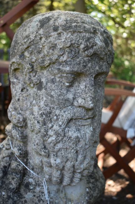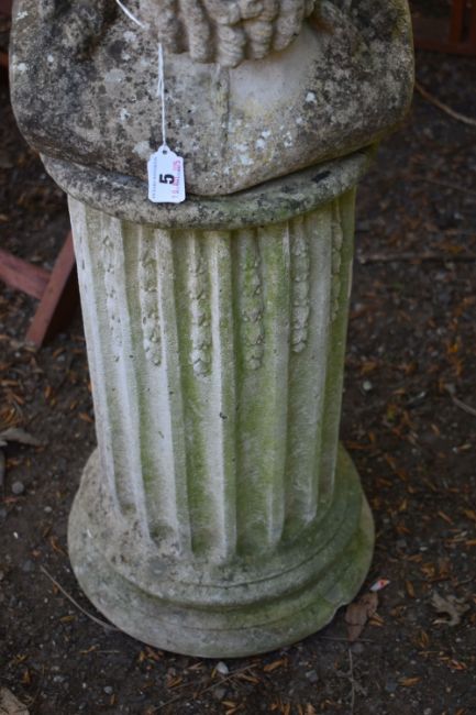 A WEATHERED COMPOSITE GARDEN BUST OF CLASSICAL ROMAN MALE, on a matched reeded pillar, height 92cm x height of pillar 50cm, condition report: small chip to base edge