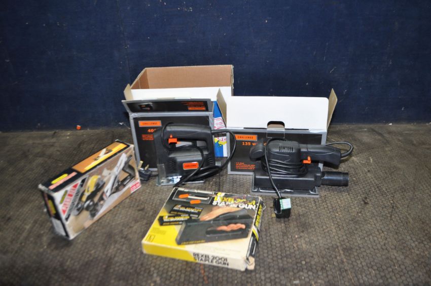 A TRAY CONTAINING POWER AND CARPENTRY TOOLS including Challenge sander and jigsaw (both PAT pass and working), a Stanley Handyman plane and a Rexel stapler