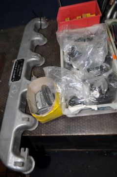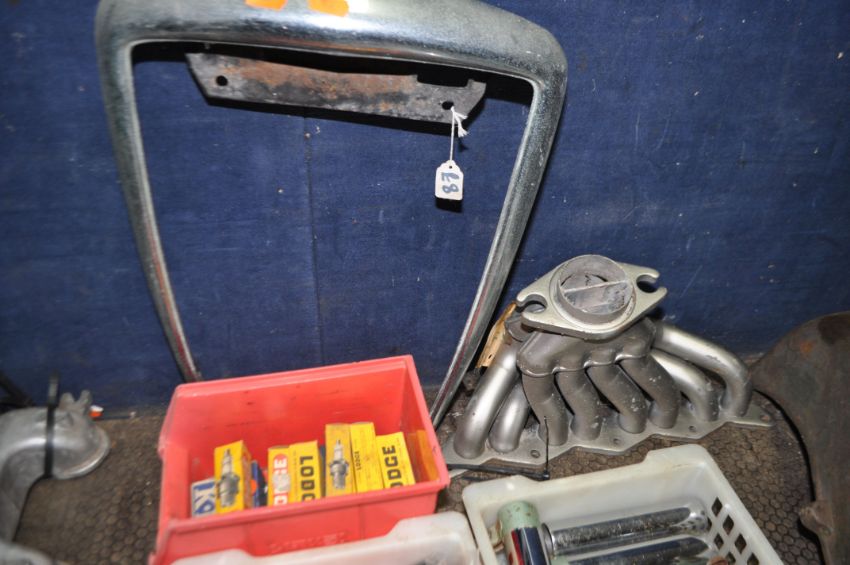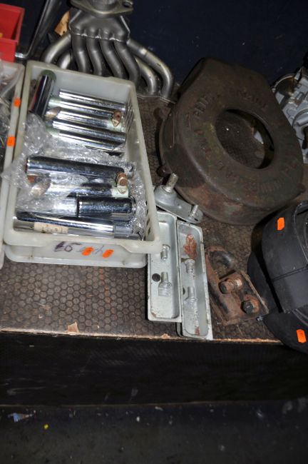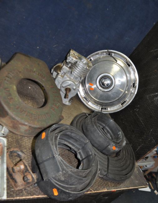 A COLLECTION OF VINTAGE CAR PARTS including four Rover hub caps, a radiator surround, a small single cylinder engine, a Petters engine cover, a tray of chromed exhaust tail pipes, a tray containing plastic numbers, a Gardner engine cover etc