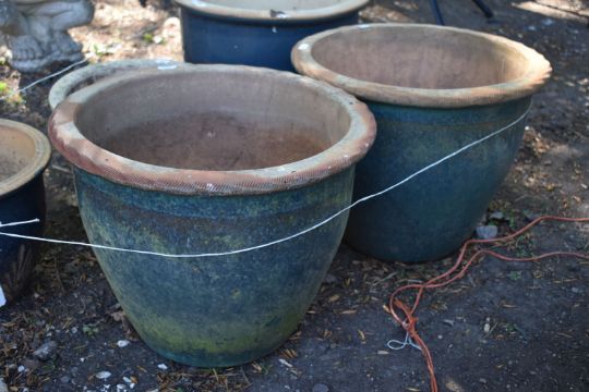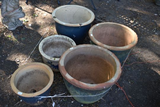 A SET OF FIVE GLAZED GARDEN POTS, of various sizes, largest diameter 38cm x height 33cm
