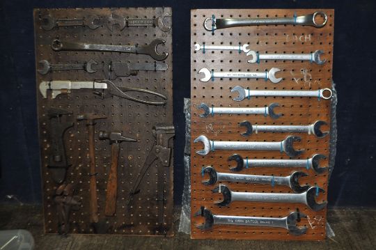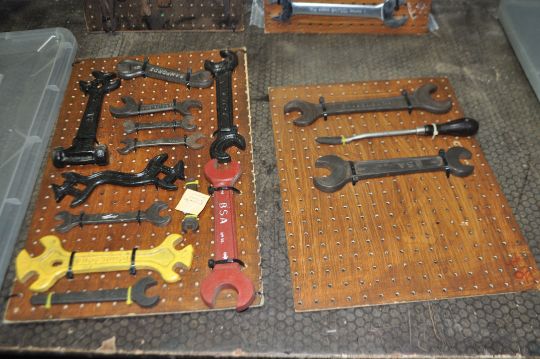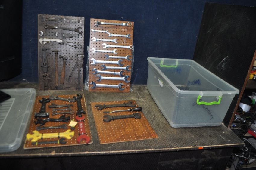 A BOX CONTAINING CARDED DISPLAYS OF VINTAGE SPANNERS AND TOOLS makers include BSA, Austin, Bamfords, Ford, Britool, etc