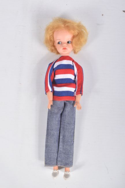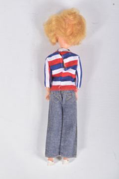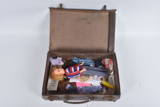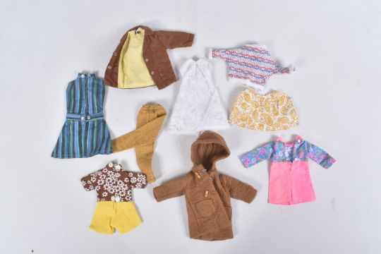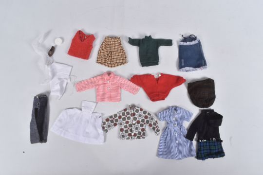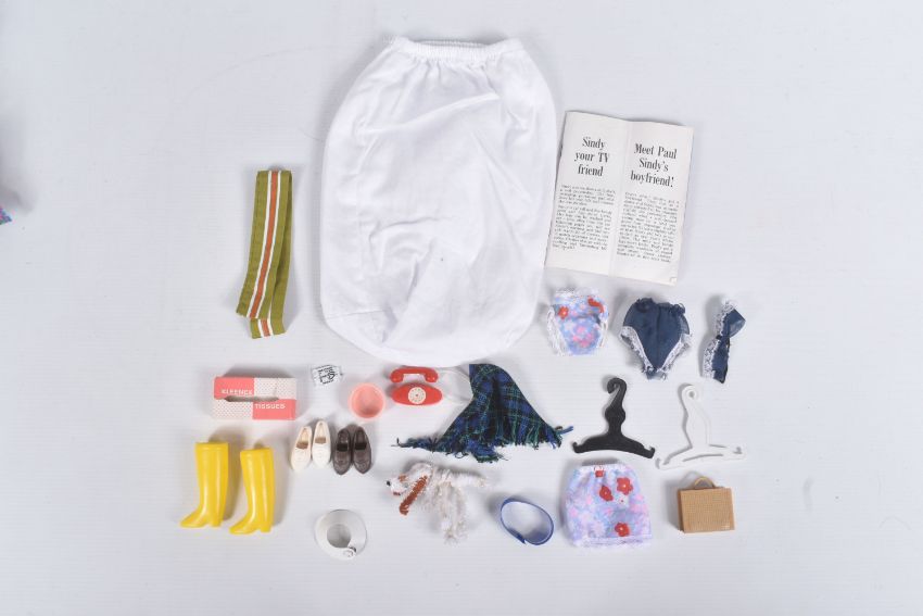 AN UNBOXED PEDIGREE SINDY DOLL, OUTFITS AND ACCESSORIES, doll is a soft vinyl head Sindy in Weekenders outfit but missing headband, doll marked 'Made in England' to back of head, appears in very good condition but appears to have had some hair loss, with a quantity of 1960's/1970's clothing and some accessories from outfits including Lunch Date, Country Walk (with Dog & Bowl), Sloppy Joe, Out & About, Duffle Coat, Emergency Ward (with Mask, Collar, Belt & Bandage), Undie World, Day Dress, Springtime & Hot Pants, Kleenex Tissue box, together with a quantity of unmarked contemporary clothing and accessories, all in playworn condition, outfits and accessories not checked for completeness