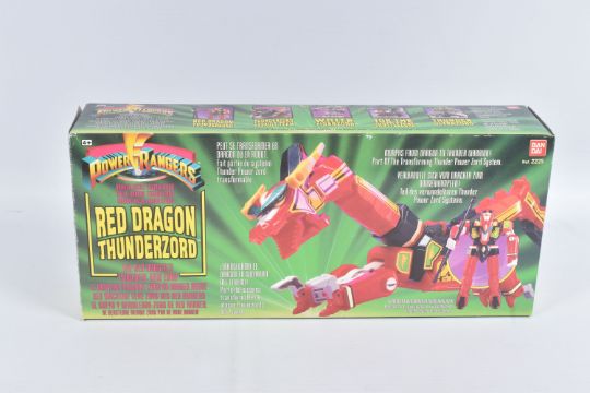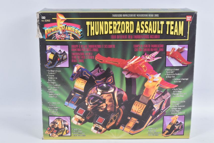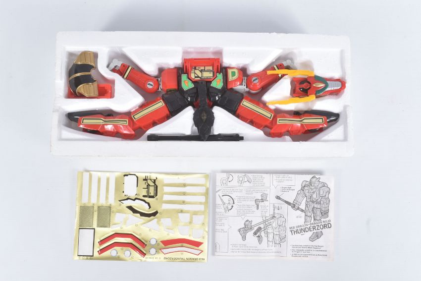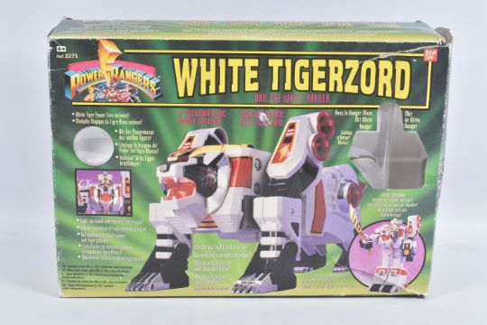 THREE BOXED 1993 BANDAI POWER RANGER MODELS, to include a White Tigerzord, reference 2271, only large model and some parts in the box with instructions, the second a Thunderzord Assault Team, reference 2262, noticeably missing large black piece, and one foot of the lion, other pieces missing from set, with instructions and spent sticker sheet, the third a Red Dragon Thunderzor, reference 2225, appears largely complete apart from much small pieces, includes instructions and spent sticker sheet, also included is a Mighty Morphin Ninjor with scabbard, a White and Red Ranger figures, and a smaller Yellow Ranger with quick changeable head, all parts not checked for completion, boxes and polystyrene packaging worn with some parts missing