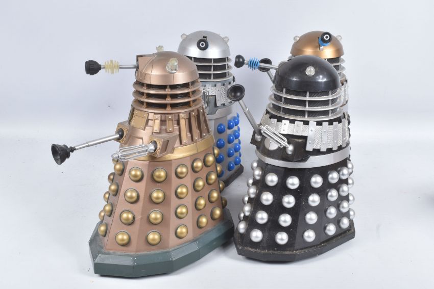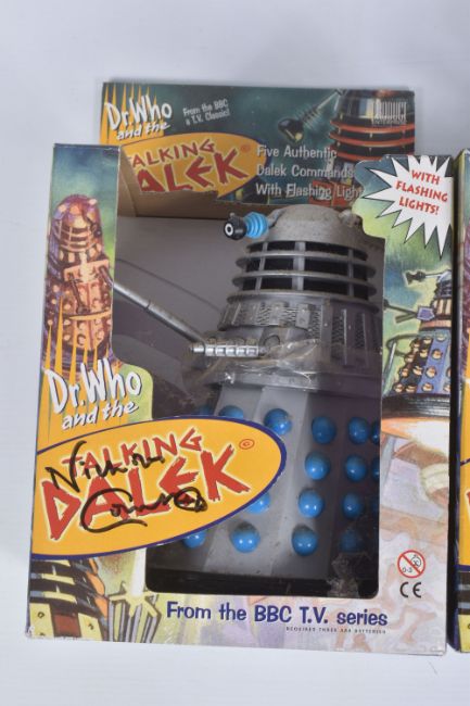 A COLLECTION OF BOXED AND UNBOXED DR. WHO AND THE TALKING DALEKS, to include three Doctor Who 'Dr. Who' BBC Talking Dalek by Product Enterprise, each is signed by Nicholas Courtney on the outer cardboard boxes, also included are four larger unboxed Dr. Who Daleks, all are in varying colours, condition is good, contents unchecked for completeness (7)