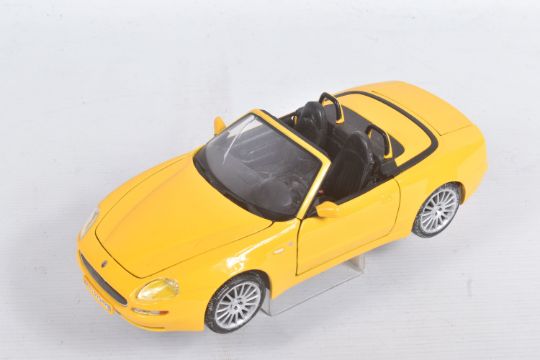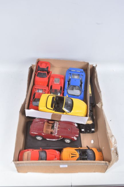 A COLLECTION OF UNBOXED DIECAST MODEL 1:18 AND 1:24 SCALE SPORTS CARS, to include six Bburago models, five Ferraris four red and one black and a Bugatti in blue, a MotorMax Lamborghini, a 1958 250 Testa Rossa on a plinth, four Maisto's, two Ferrari and one Maserati Spyder in yellow, a Ferrari, and a Polistil Ferrari in black, these are in varied conditions (13)