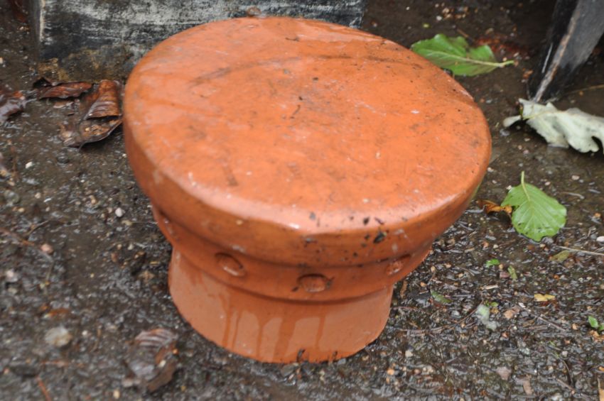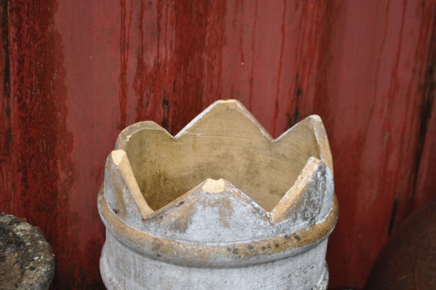 A CHIMNEY POT, and a terracotta chimney topper (2) Condition Report: some peaks missing from pot