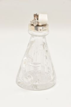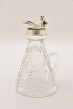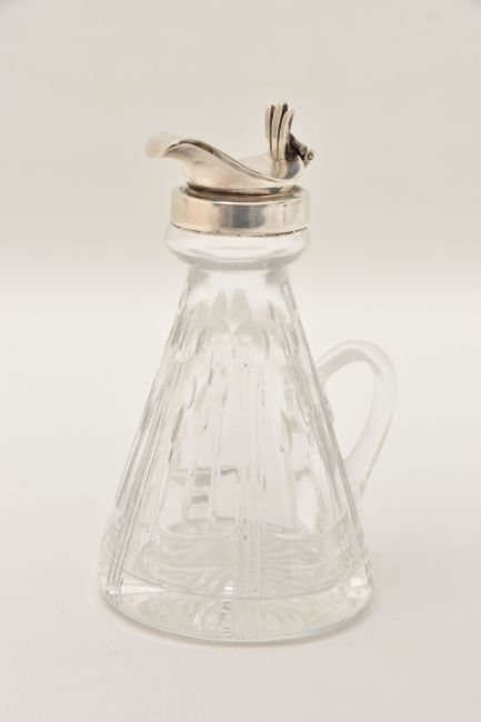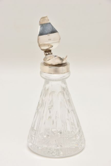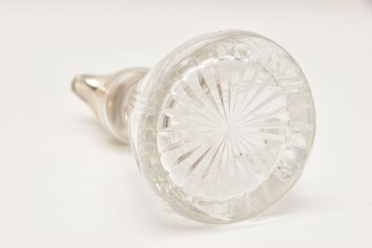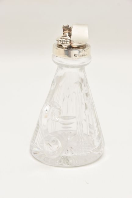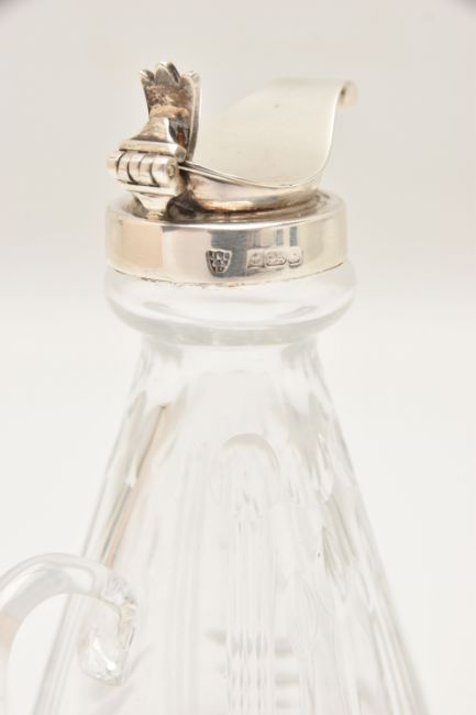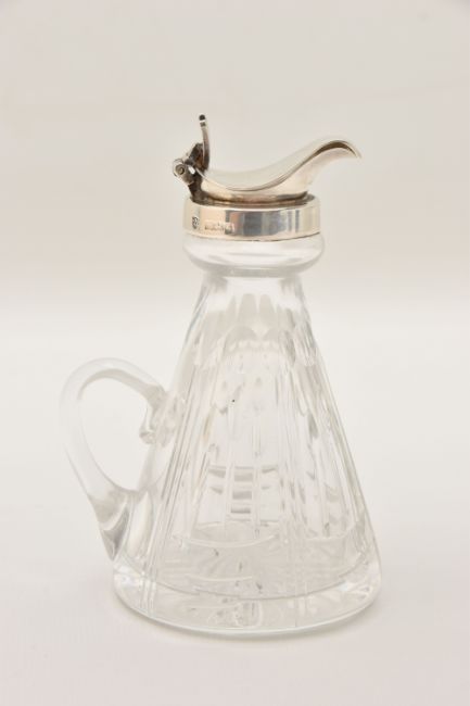 A CRYSTAL CUT GLASS AND SILVER CAPPED WHISKY NOGGIN hallmarked 'J.B Chatterley & Sons Ltd Birmingham 1983,' height 11.5cm x diameter of base 6cm (1) (Condition Report: light tarnish to the silver around the handle and band, interior could benefit from a light clean)