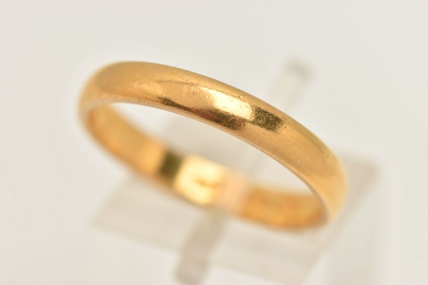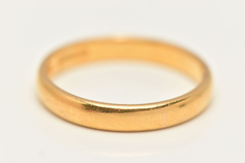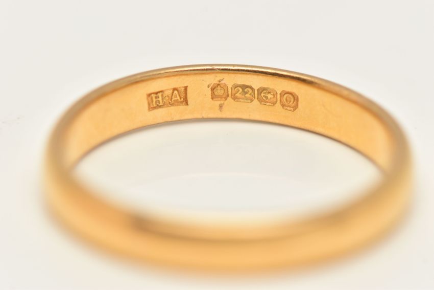 A 22CT GOLD BAND RING, a plain polished yellow gold band ring, approximate width 3mm, hallmarked 22ct Birmingham, ring size Q 1/2 leading edge, approximate gross weight 4.7 grams, (condition report: general moderate wear, overall condition good)