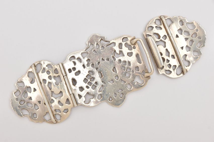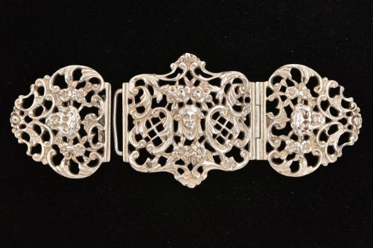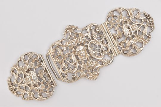 A LATE VICTORIAN SILVER TRIPLE NURSES BUCKLE, open work scrolling design with floral patterns and faces, one hinged side, the other with interlocking clasp, hallmarked 'Goldsmiths & Silversmiths Co' London 1898, approximate length 16cm, approximate gross weight 125.1 grams, 4.02 ozt (Condition Report: general light wear)