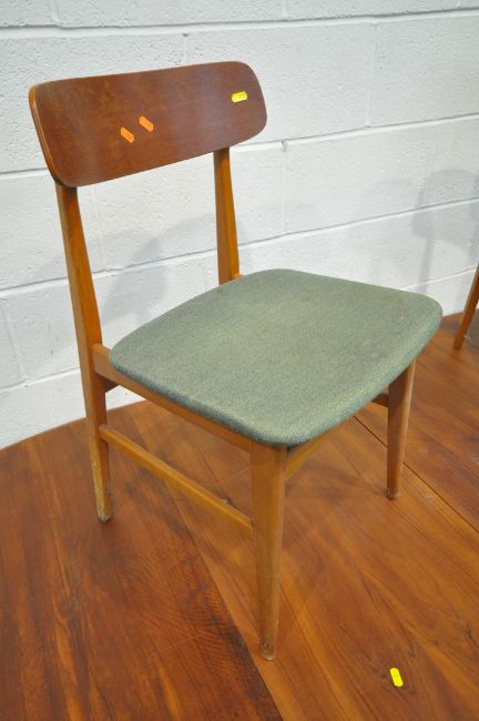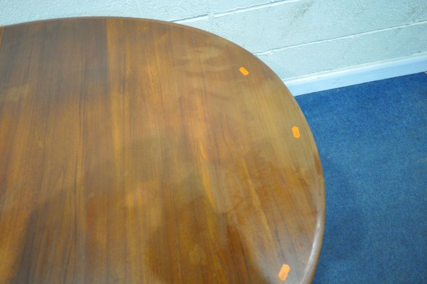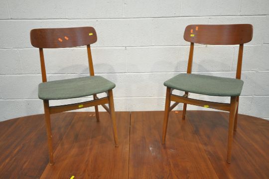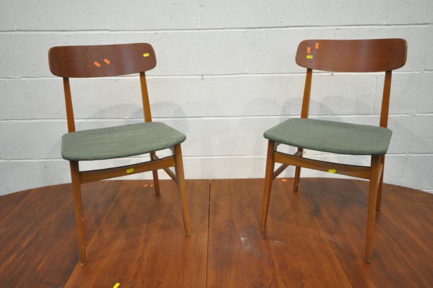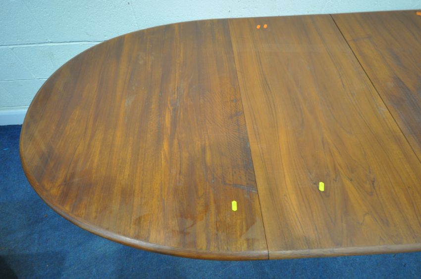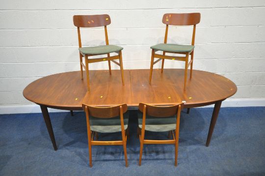 GUDME MOBELFABRIK, A DANISH MID-CENTURY TEAK OVAL EXTENDING DINING TABLE, with two additional leaves, raised on cylindrical tapered legs, extended length 247cm x closed length 149cm x depth 102cm x height 73cm, along with a set of four Ulferts Tibro Swedish chairs, condition report: marks, scuffs, stains, discolouration, other wear and usage (7)