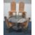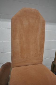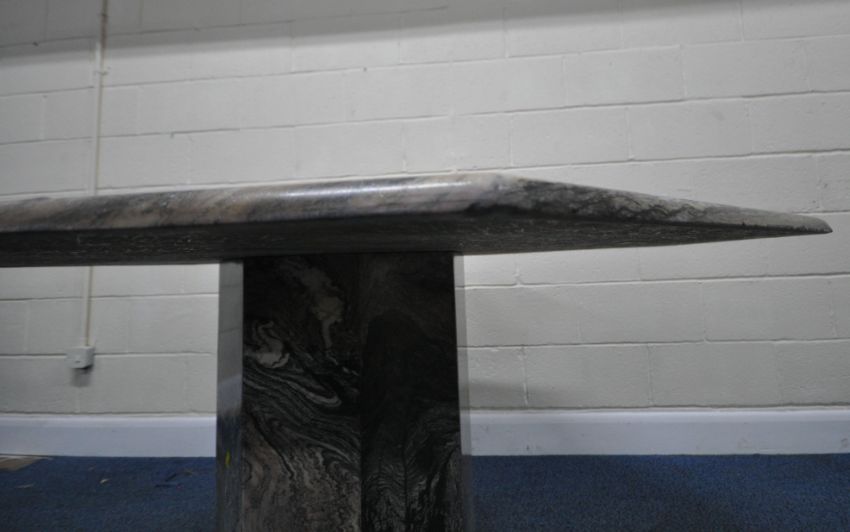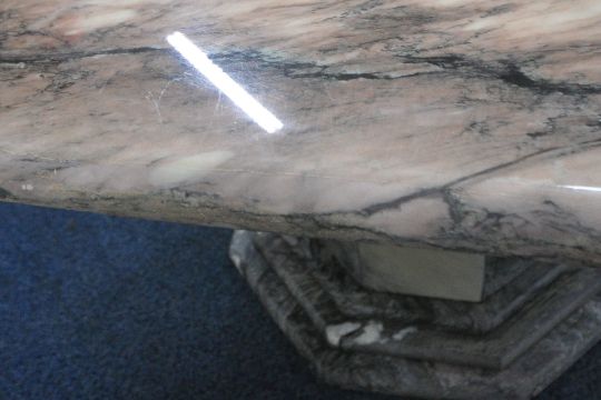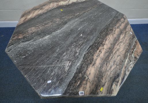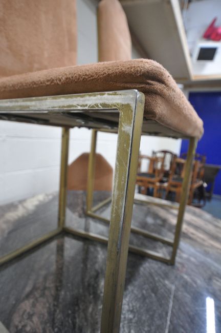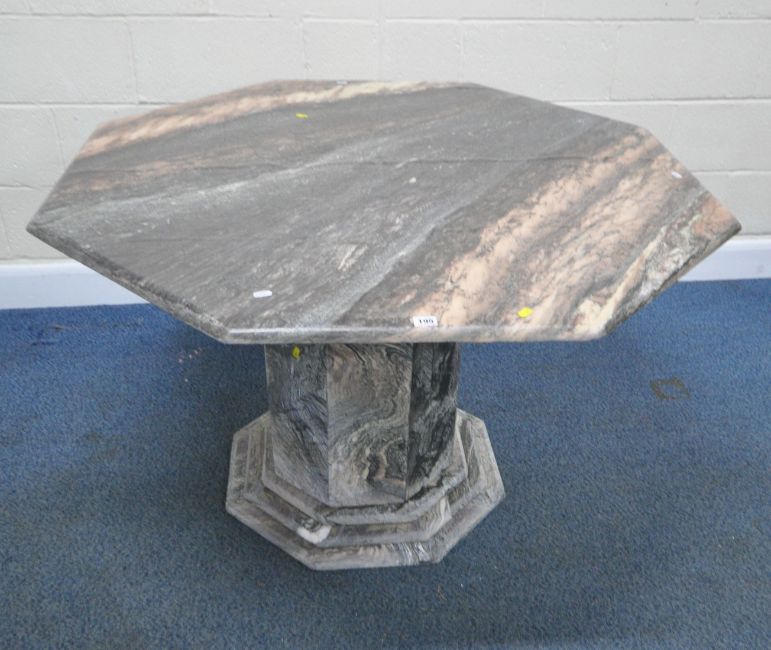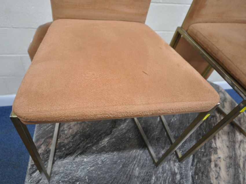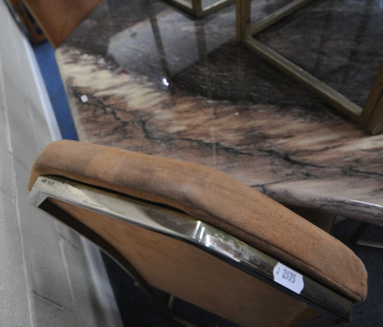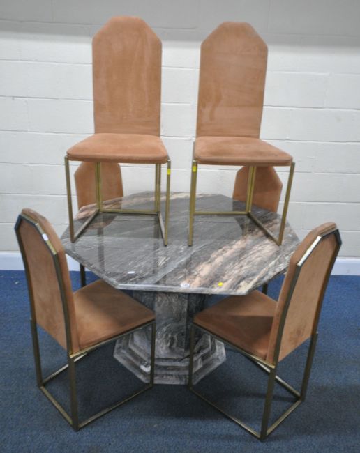 AN OCTAGONAL MARBLE TABLE, raised on a single pedestal, with a stepped base, diameter 130cm x height 76cm, along with a set of six suede upholstered chairs, on brass tubular metal legs, condition report: none of the chairs have fire regulation labels so do not comply with the Furniture and Furnishings fire Safety Regulations 1988 and therefore, should not be used in a private dwelling, all stained and worn, legs with scuffs and scratches, the table with small chips to the edges, the lacquer has worn, other general signs of usage (7)
