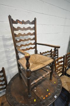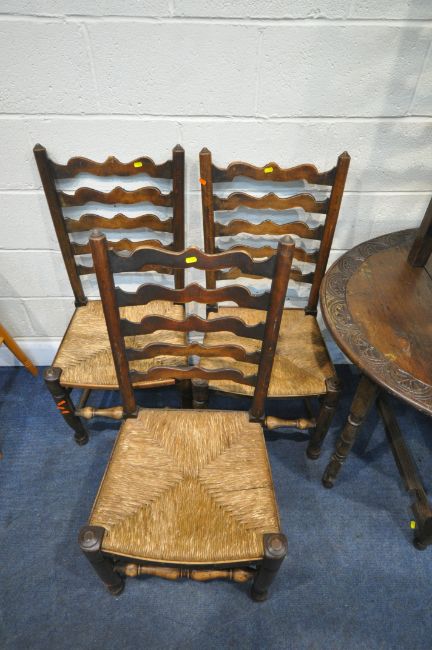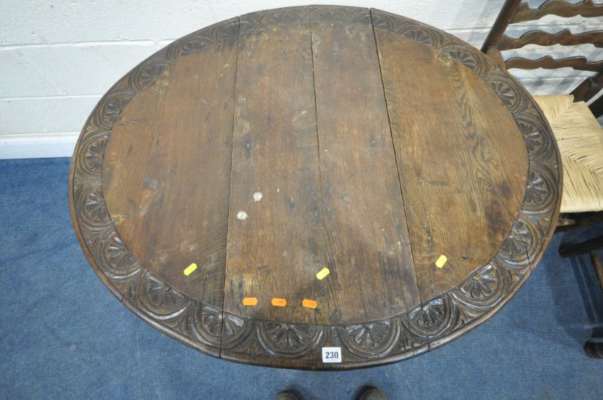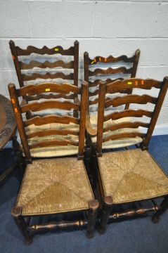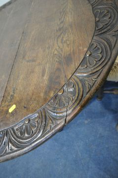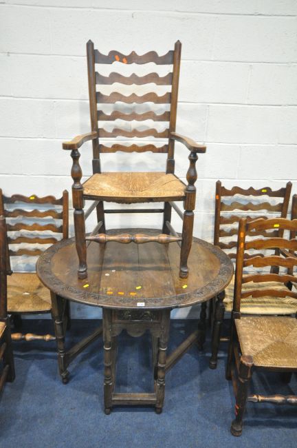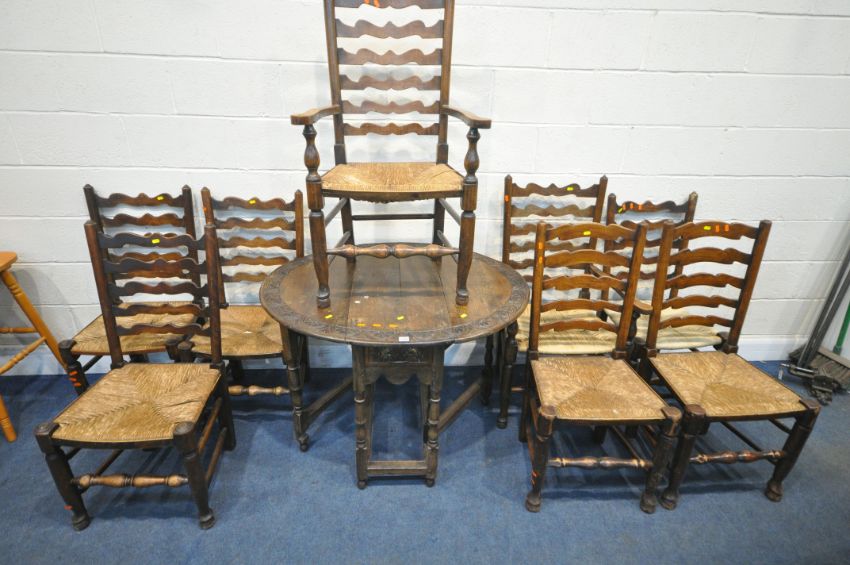 A GEORGIAN OAK OVAL GATE LEG TABLE, with repeating patterns, and a single drawer, open width 106cm x depth 90cm x height 74cm, along with a set of four chairs, including one carver, and two other pairs of chairs, condition report: all with imperfections, such as historical marks, scuffs, stains, splits, rickety frames, other wear and usage (9)