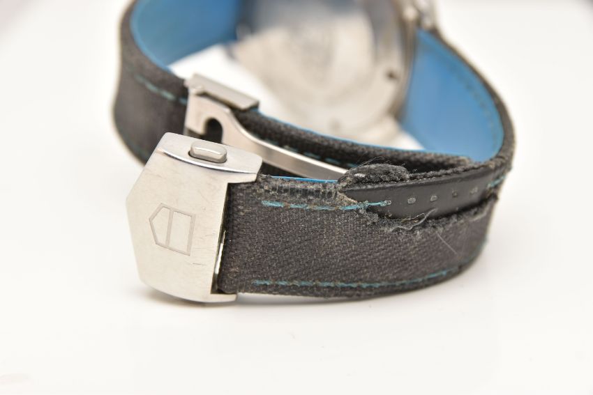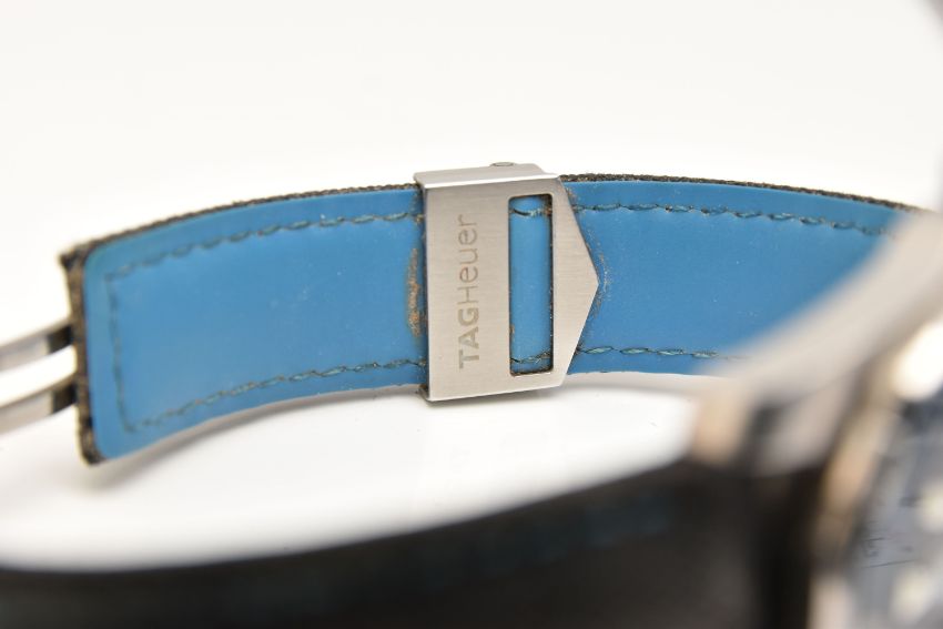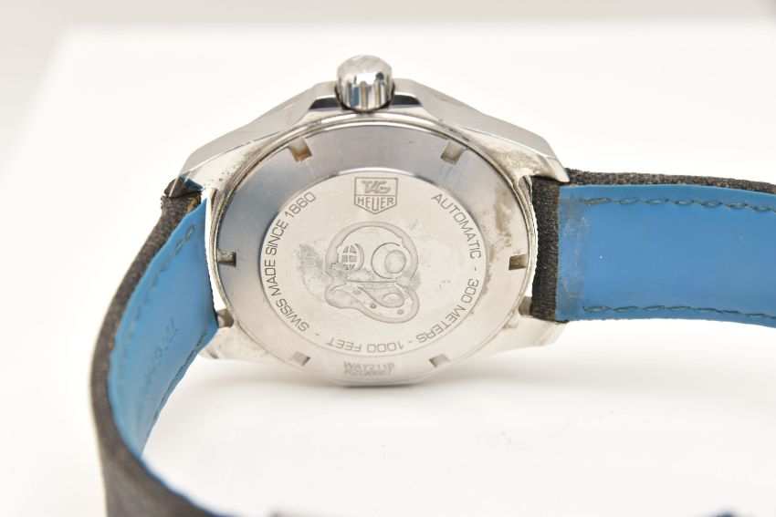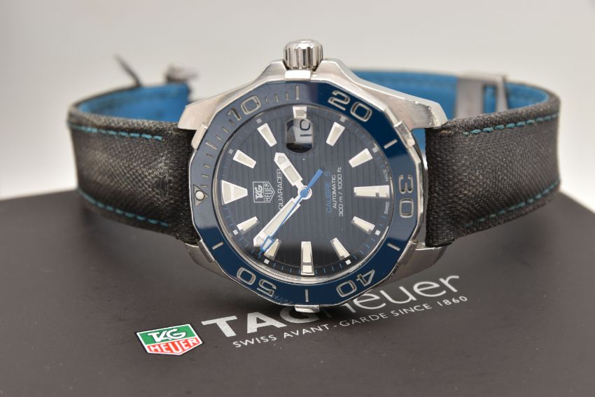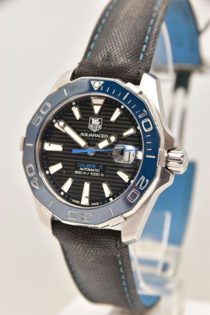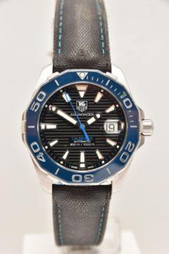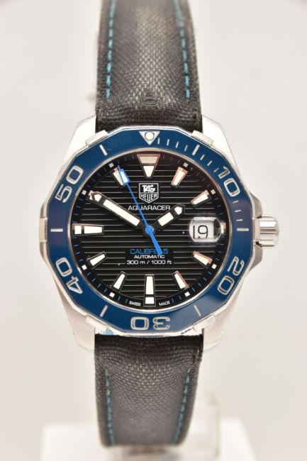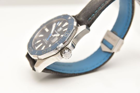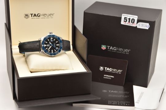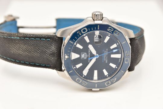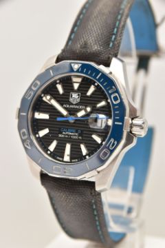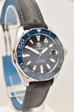A GENTS 'TAG HEUER' WRISTWATCH, automatic movement, round black dial signed 'Tag Heuer Aquaracer, Automatic, white baton markers, date aperture at the three o'clock position, blue bezel, case back signed 'Tag Heuer, Automatic-300 Metres -1000 Feet' numbered WAY211B, RZG6667, screw down case back, approximate case width 41mm excluding crown, fitted with a fabric bracelet and folding deployment clasp, with box and international guarantee card dated 22/12/15, trans no. 1630949, serial number WAY211B, RZG6667 (condition report: general light wear, watch winds, sets and runs at time of cataloguing although time keeping has not been tested, we cannot guarantee the working order of any watch, case back has not been removed)