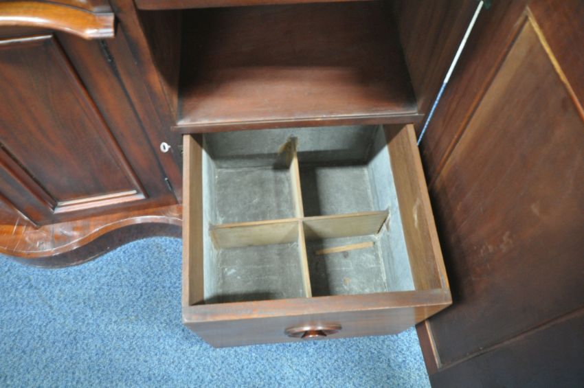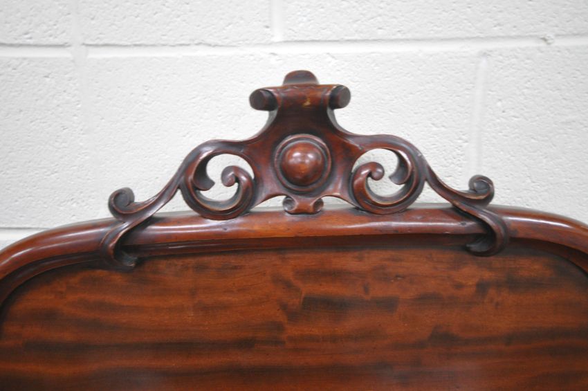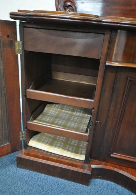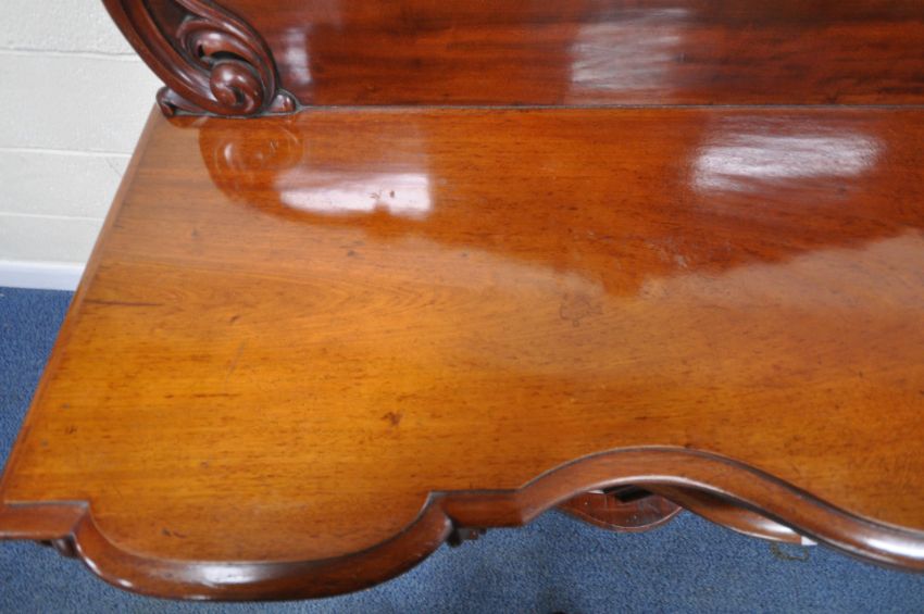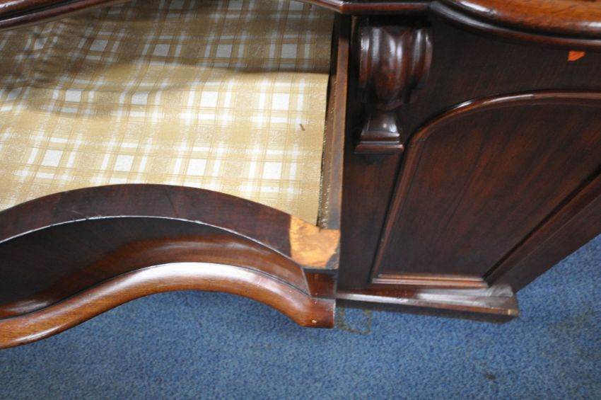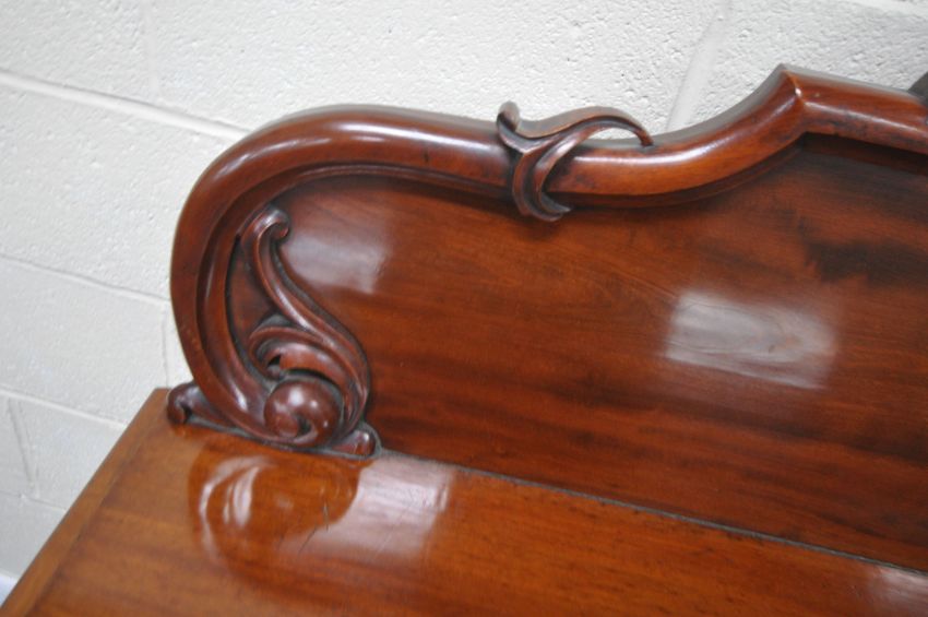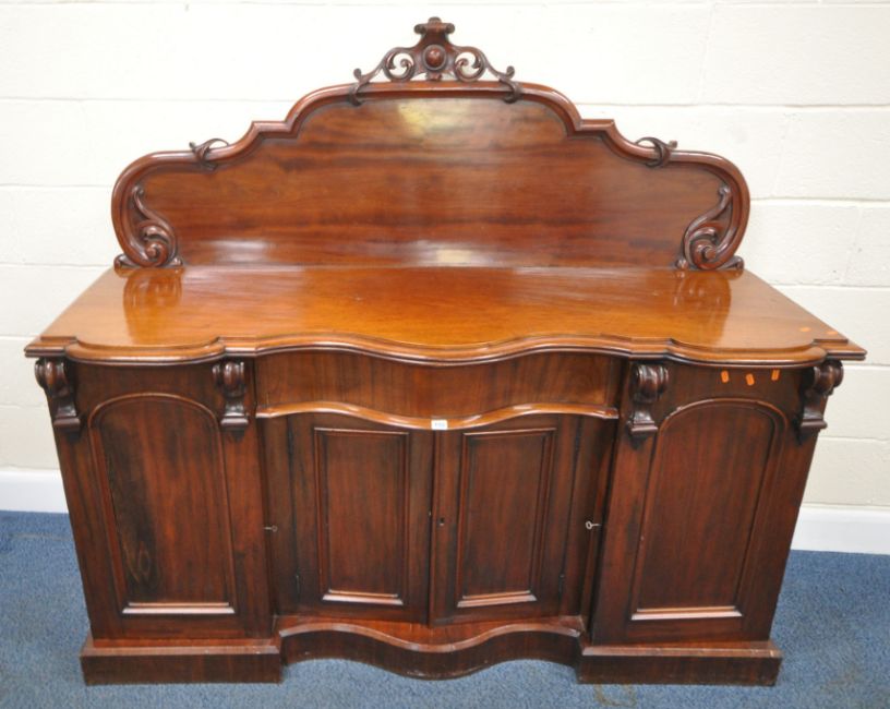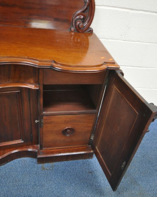 A VICTORIAN MAHOGANY SIDEBOARD, the raised back with scrolled and foliate details, a serpentine front, a single drawer, and four cupboard doors, length 169cm x depth 62cm x height 149cm, condition report: top detaches from the base historical marks, scuffs, discolouration, other wear and usage, two keys