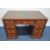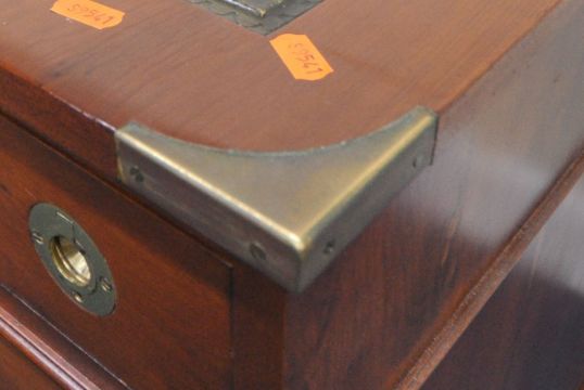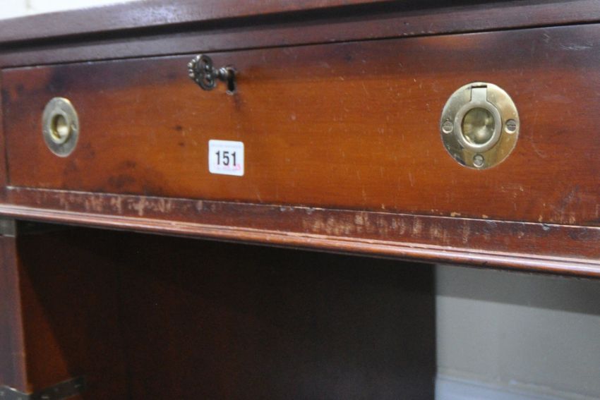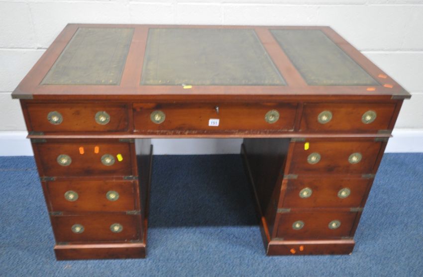 A 20TH CENTURY YEW WOOD TWIN PEDESTAL DESK, with a three green leather writing surfaces, with brass banding and campaign handles, width 124cm x depth 76cm x height 75cm, condition report: marks, scuffs, stains, discolouration, other general signs of usage