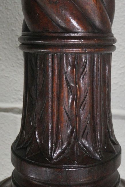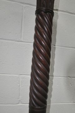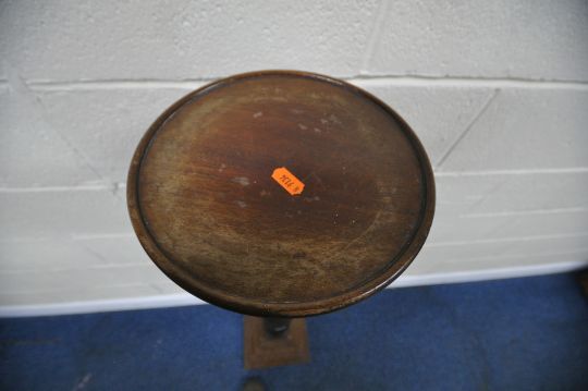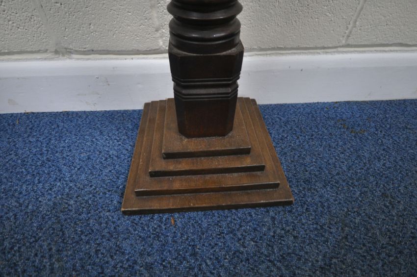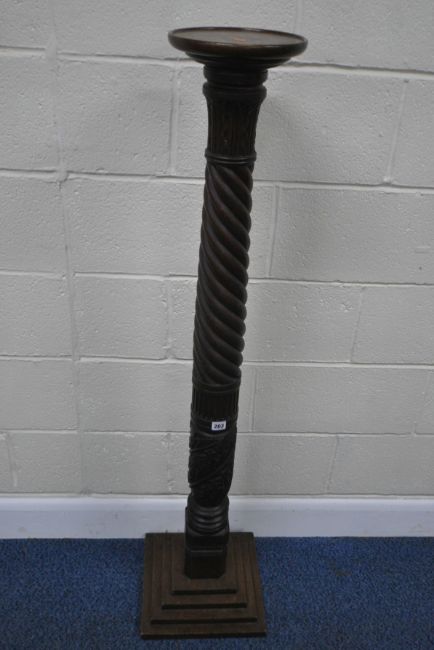 A 20TH CENTURY OAK PLANT STAND, with a dished top, foliate details, a spiral support, on a four stepped base, height 136cm, condition report: the dish top with marks, scuffs, stains, other general signs of usage
