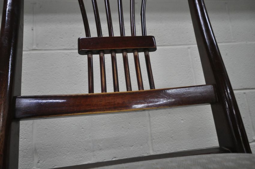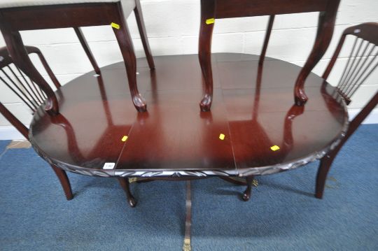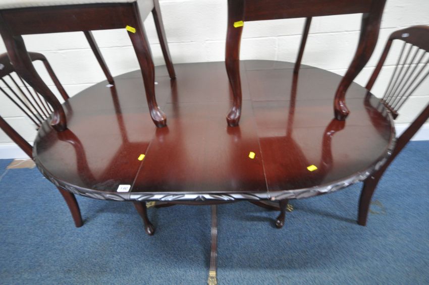 A LATE 20TH CENTURY MAHOGANY EXTENDING DINING TABLE, raised on a single pedestal with four legs, extended length 140cm x diameter 104cm x height 76cm, along with a set of four chairs, condition report: one chair back spindle damaged, all with marks, scuffs, discolouration, table legs wobbly, other wear and usage (5)