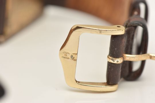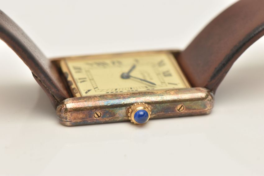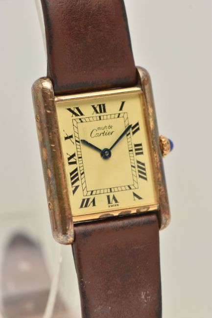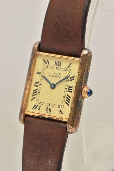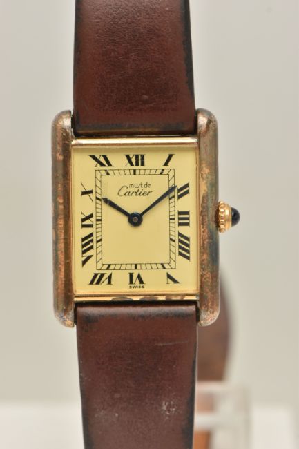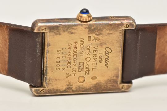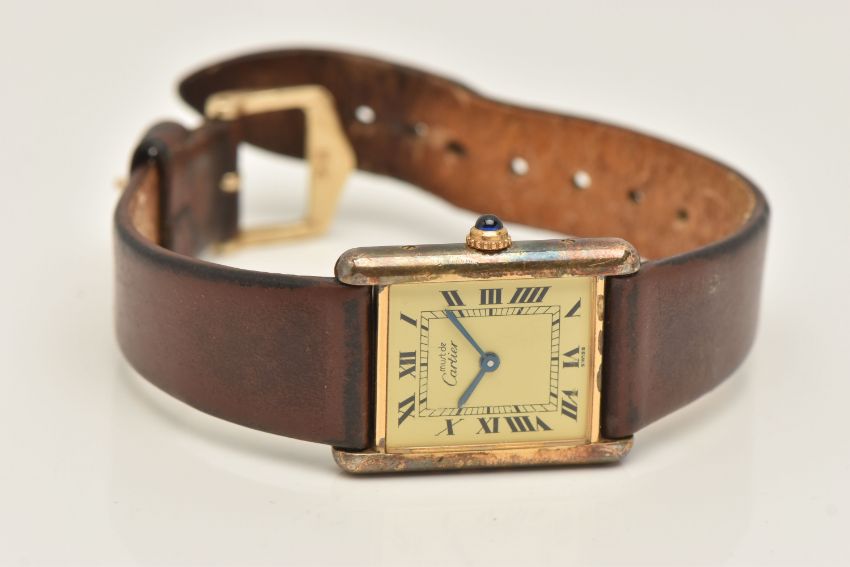 A 'MUST DE CARTIER' GILT TANK WRISTWATCH, quartz movement, cream rectangular dial signed 'Must De Cartier', Roman numerals, blue steel hands, approximate case dimensions length 23mm excluding lugs x width 23mm, gilt case with some wear, screw down case back signed 'Cartier Paris Vermeil, Tank Quartz Argent, 925, Plaque OrG 20m, Swiss Made numbered 118138, 590005, stamped with Swiss silver control marks, fitted with a brown strap and ardillon buckle (condition report: not currently ticking, scratches to the glass cover, some wear and discolouration to the case and strap, we cannot guarantee the working order of any watch)