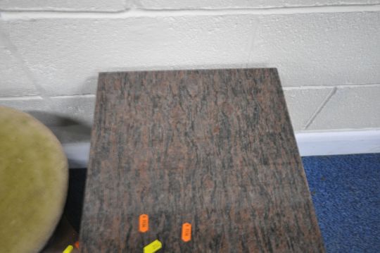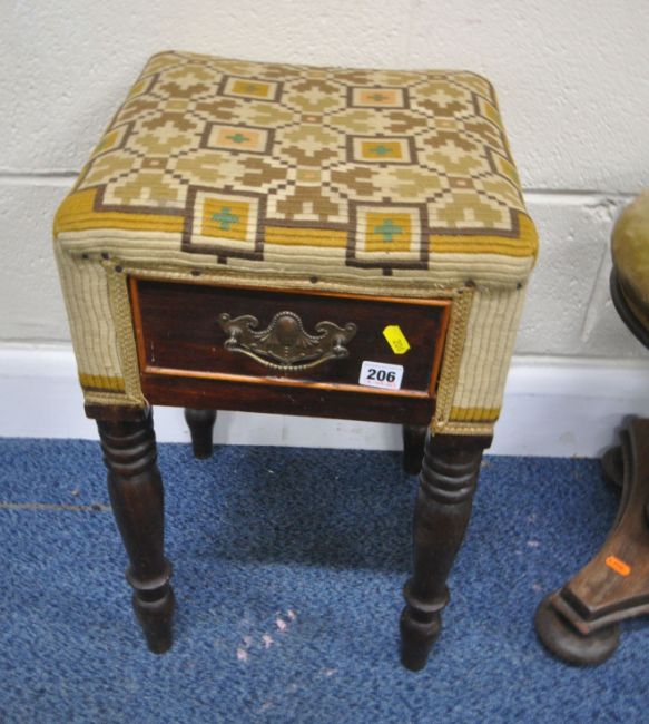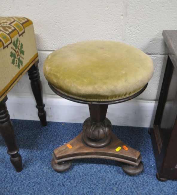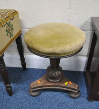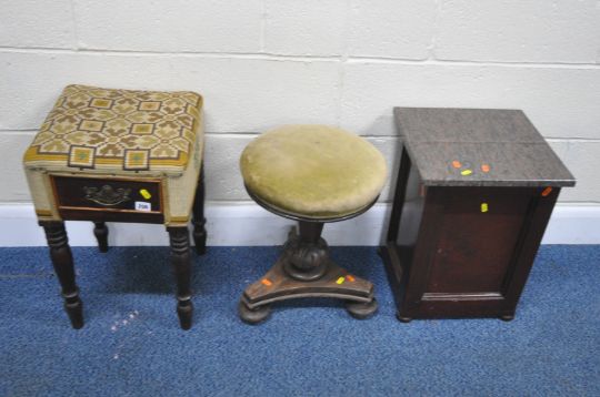 A 19TH CENTURY MAHOGANY STOOL, with a swivel height adjustable seat, on a tri-form base, minimum height 47cm, another stool with a single drawer, along with a storage box, with a later marble top, condition report: all with imperfections, such as marks, scuffs, stains, discolouration, other wear and usage (3)