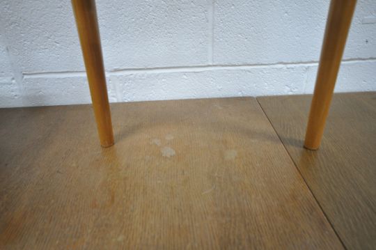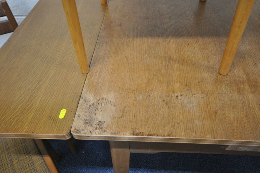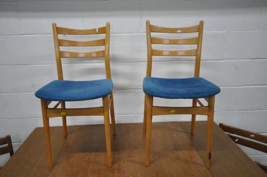 A 20TH CENTURY OAK DRAW LEAF DINING TABLE, raised on square tapered legs, extended length 154cm x closed length 92cm x depth 77cm x height 77cm, along with a set of four chairs, and a pair of chairs, condition report: none of the chairs have fire regulations labels so do not comply with the Furniture and Furnishings fire Safety Regulations 1988 and therefore, should not be used in a private dwelling, all with marks, scuffs, stains, scratches, other wear and usage (7)