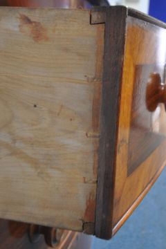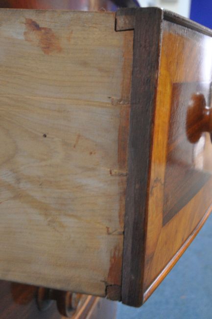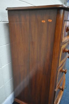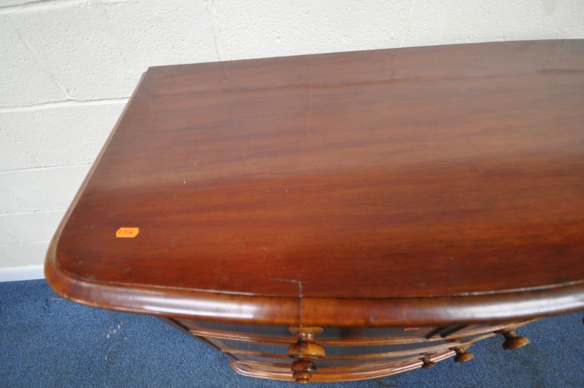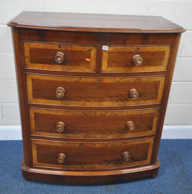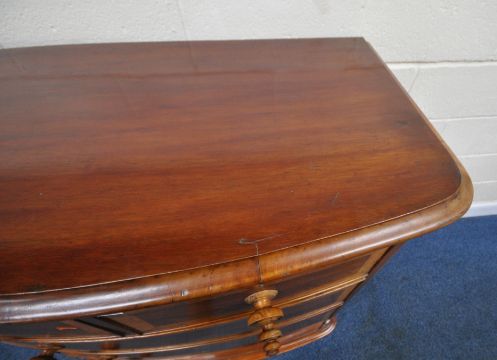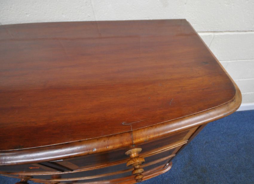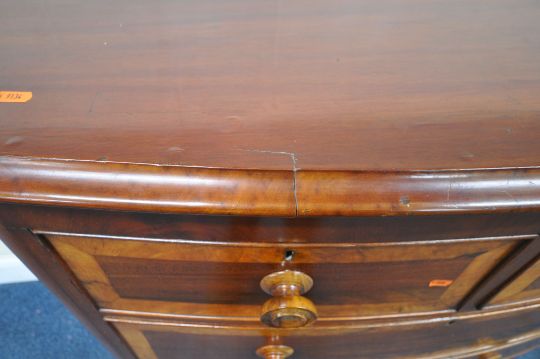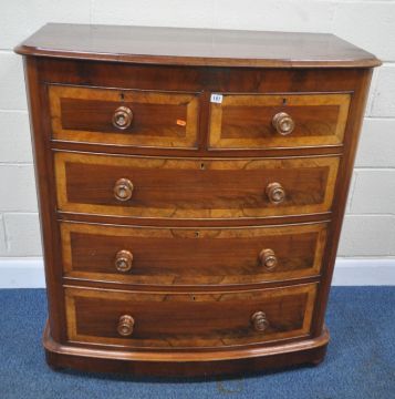 A 19TH CENTURY MAHOGANY BOW FRONT CHEST OF TWO SHORT OVER THREE LONG DRAWERS, with walnut cross banding, width 108cm x depth 56cm x height 119cm, condition report: historical marks, scuffs, splits, other wear and usage