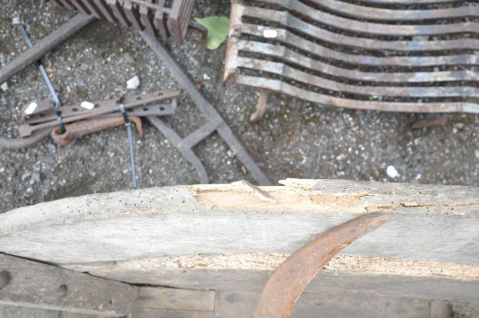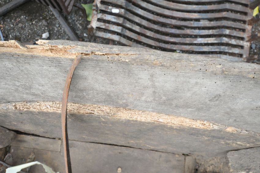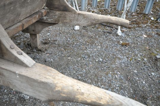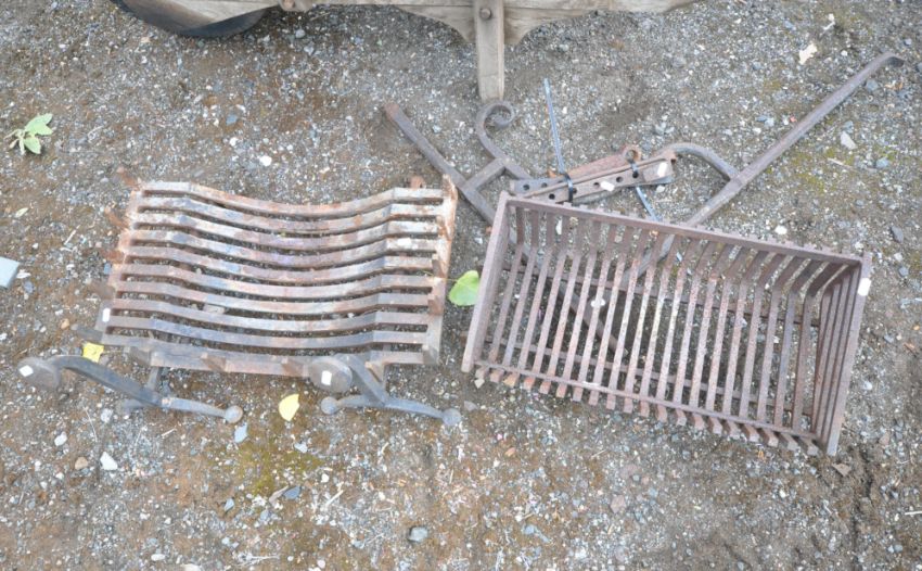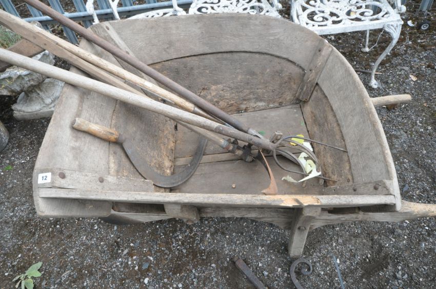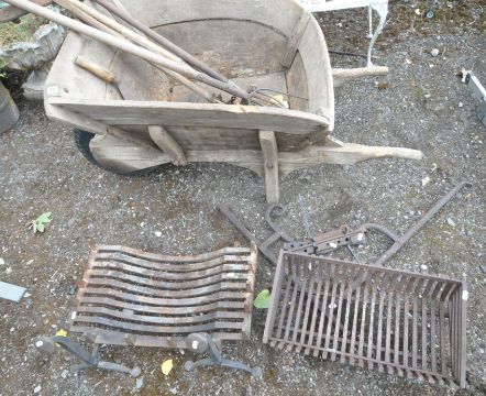A VINTAGE WOODEN WHEEL BARROW, height 73cm, a quantity of gardening tools, cast iron fire dogs, a fire grate, etc, condition report: wheel barrow and tools with a lot of woodworm, cast iron items rusty, other wear and usage (5+)