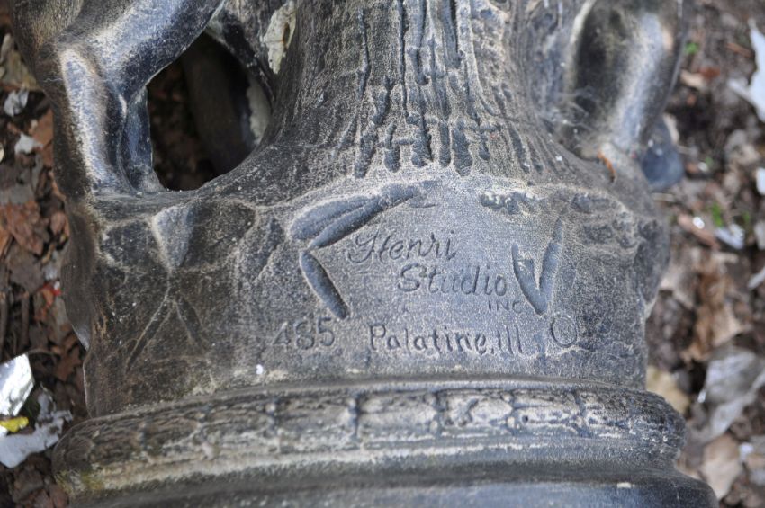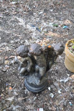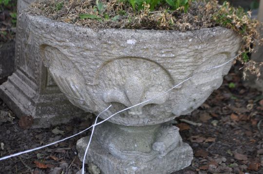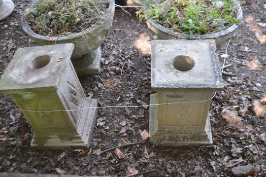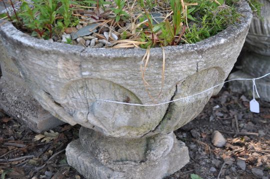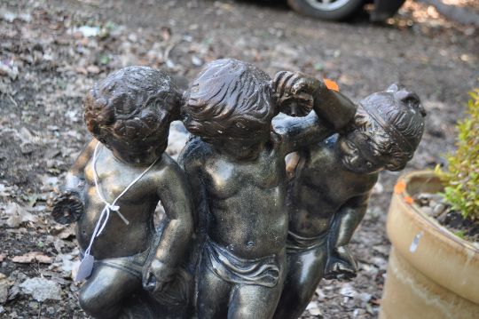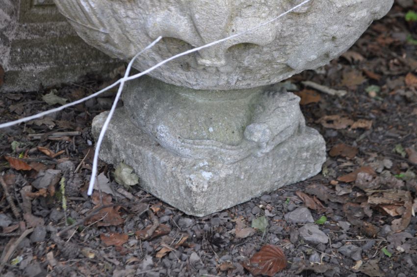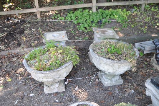 A PAIR OF CARVED RECONSTITUTED STONE GARDEN URNS, with coats of arms and Fleur de Lys detail to 60cm diameter bowl, with a dragon curled around stem and square footing, along with two concrete square bases, Condition Report: one has a crack to bowl, along with a Henri Studio model 485 figural water feature, in the form of three children with flower petals and pipework to the stems, height 58cm, Condition Report: no obvious damage (5)