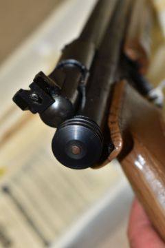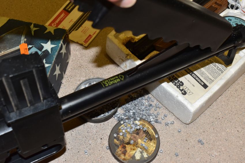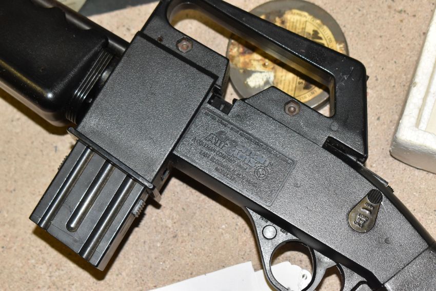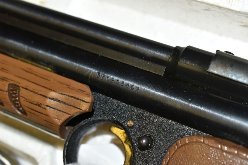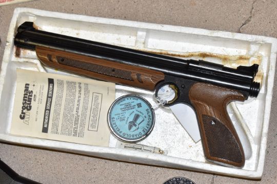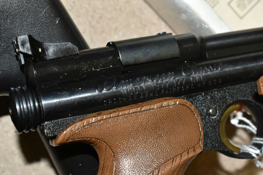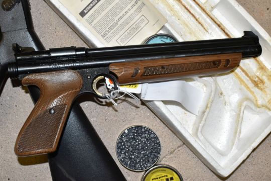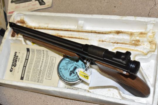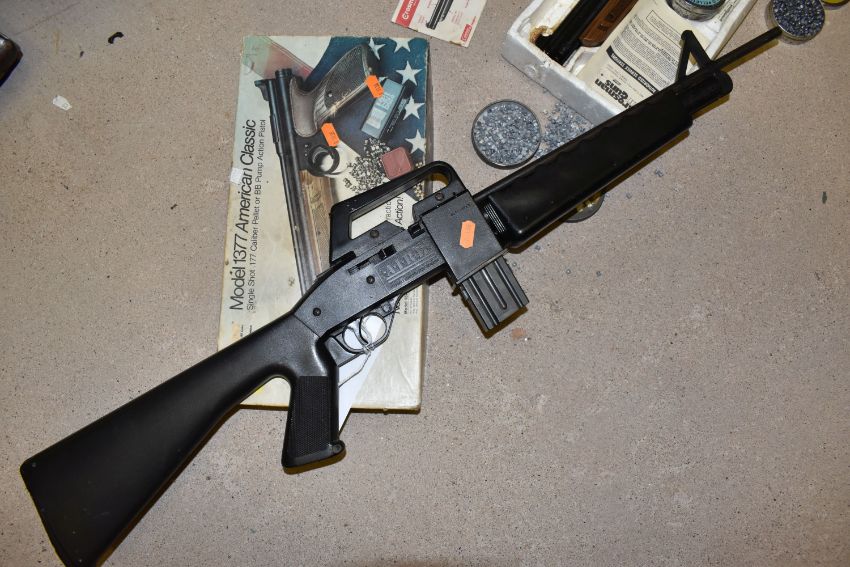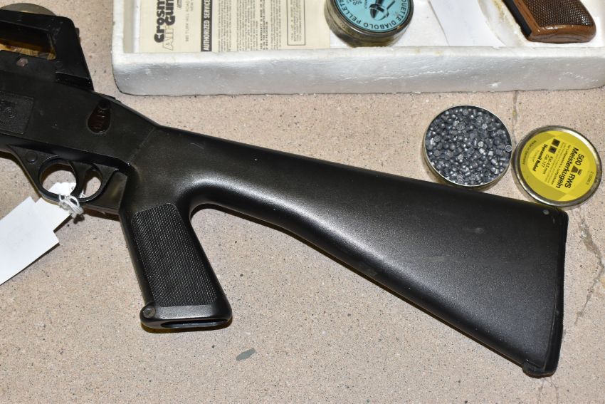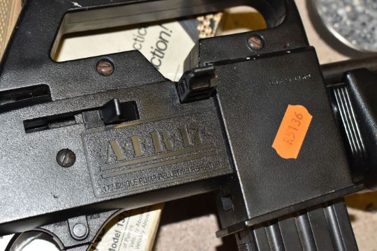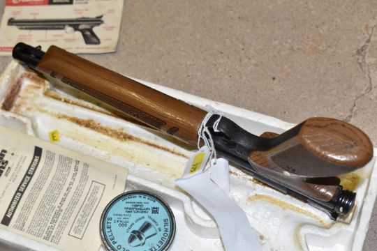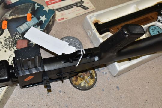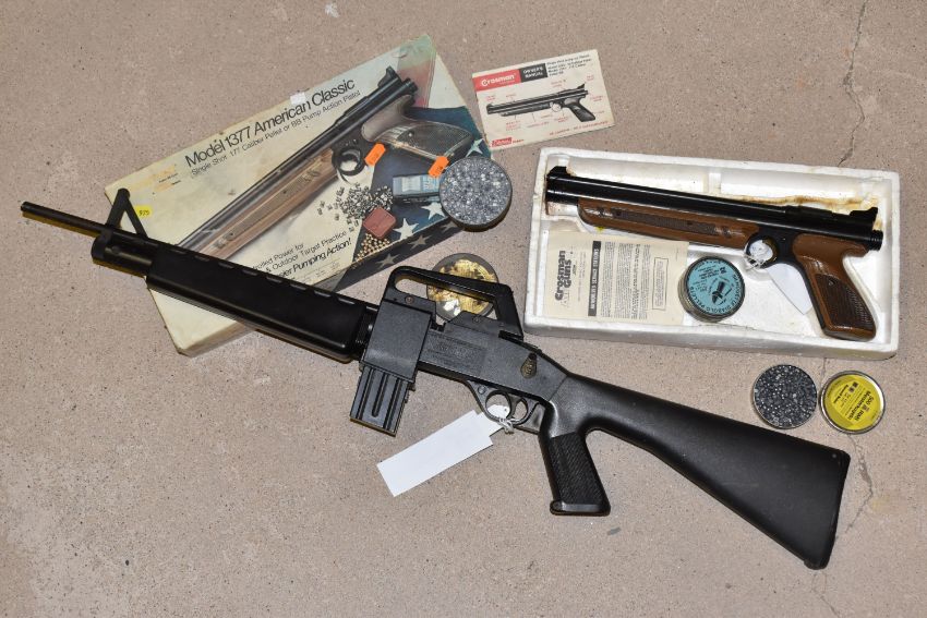 A CROSMAN AIR 17 .177 SINGLE PUMP PELLET / BB REPEATER, in the form of an m16, along with a Crosman Model 1377 American Classic single shot .177 pellet / BB pump auction pistol, and three tins containing .177 pellets (2) PURCHASER MUST BE OVER THE AGE OF 18 YEARS, FACE TO FACE COLLECTION OR SPECIALIST COLLECTION WILL BE REQUIRED FOR THIS LOT