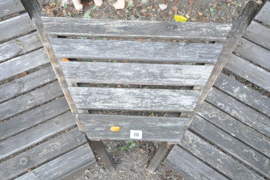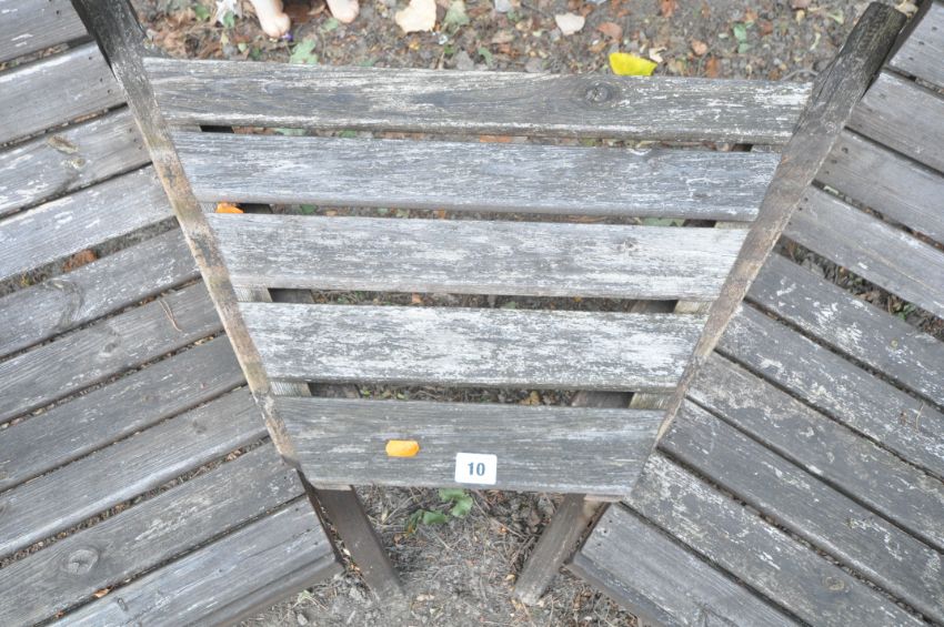 A PAIR OF WEATHERED TEAK GARDEN ARMCHAIRS, united by a shelf, each chair width 69cm x depth 75cm x height 98cm, condition report: weathered, slightly rickety, other signs of usage (3)