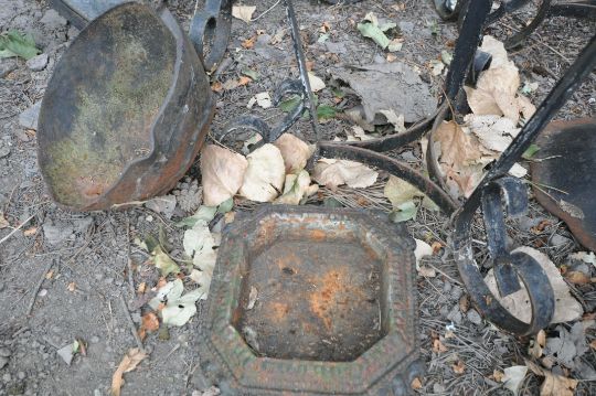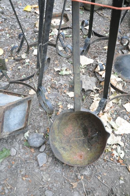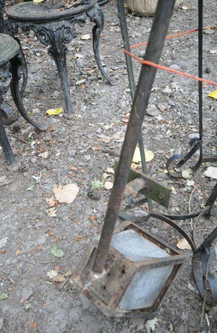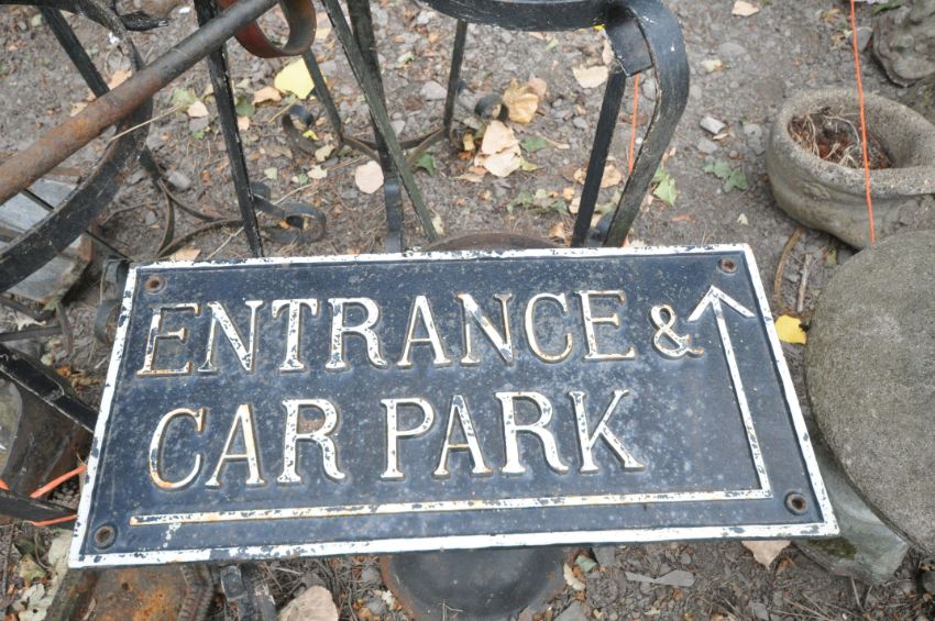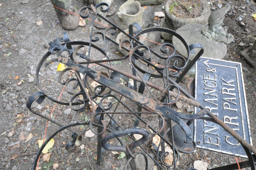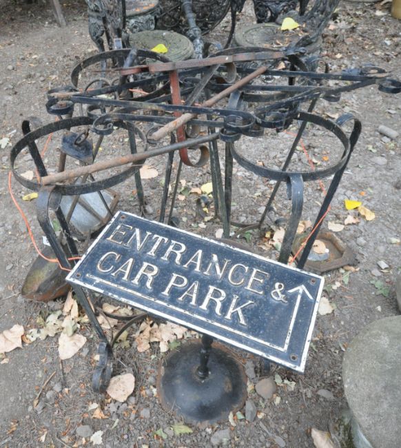 A SELECTION OF WROUGHT AND CAST IRON ITEMS, to include four stands, a lantern, an ash tray, an entrance & car park sign, etc, condition report: all with some rust, patina, weathering, other signs of usage (5+)