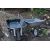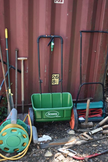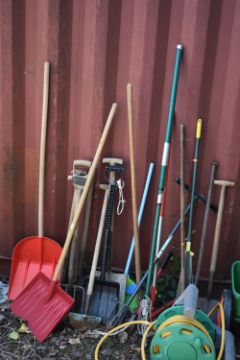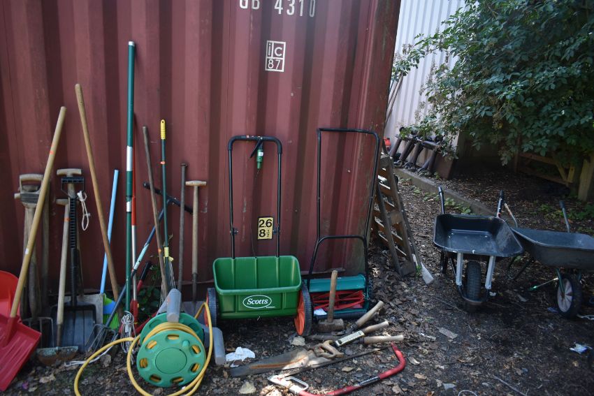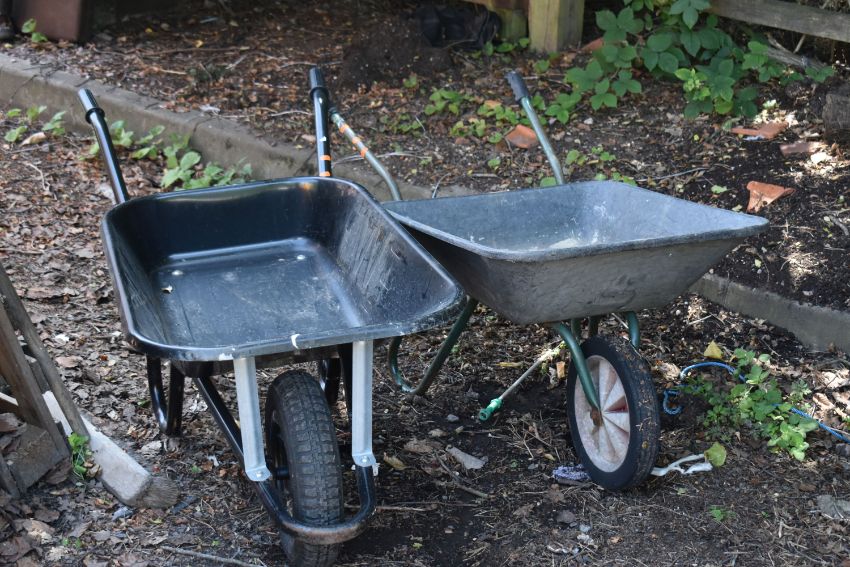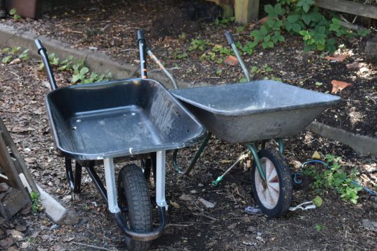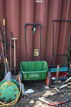A SELECTION OF GARDEN HAND TOOLS AND ACCESSORIES, to include two metal wheelbarrows, a Bosch push lawnmower, a Scotts lawn seeder, rakes, spades, shovels, etc (20+)