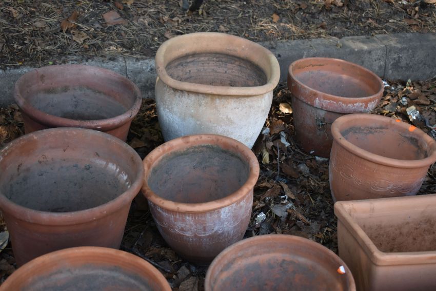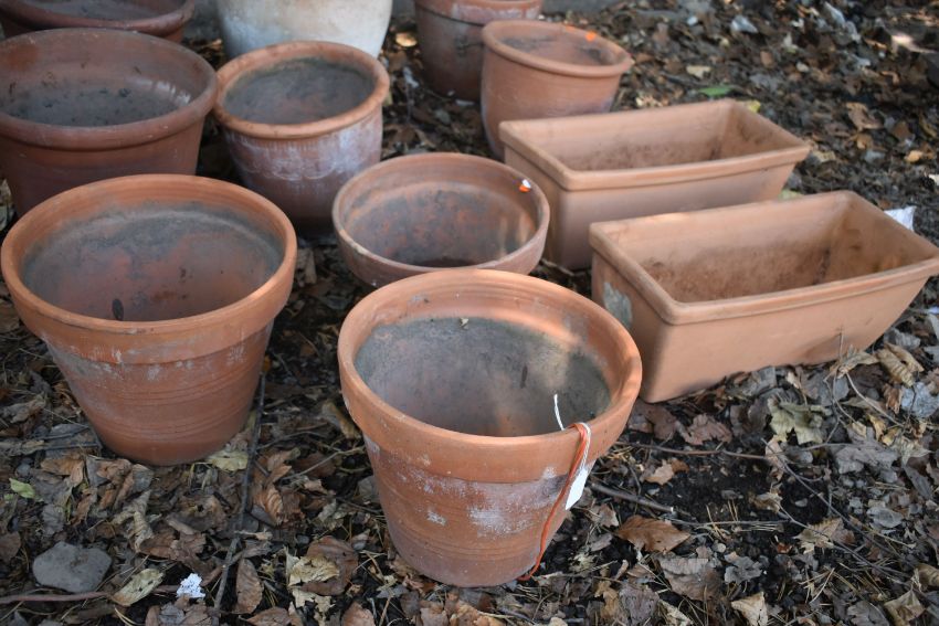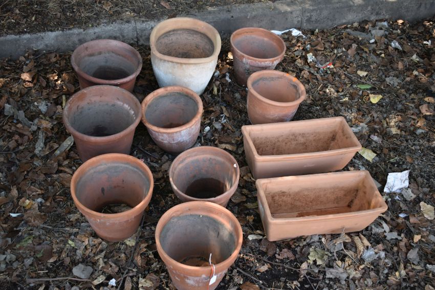 A SELECTION OF TERRACOTTA PLANT POTS, of various sizes, along with two rectangular planters, condition report: all weather, some cracks (11)