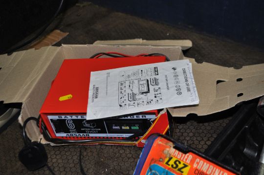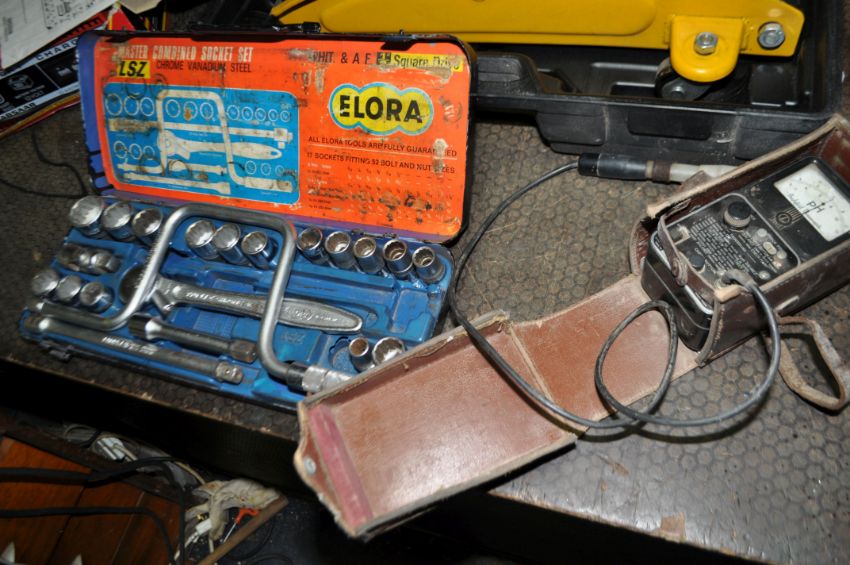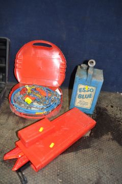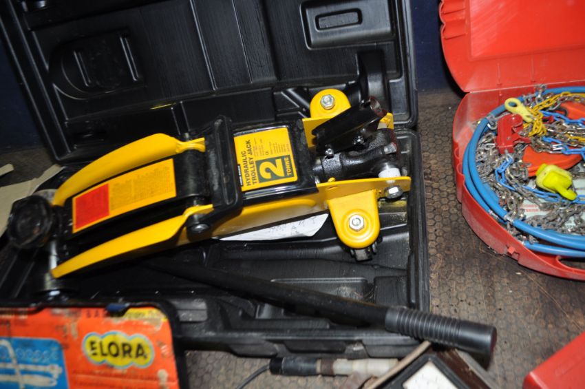 A COLLECTION OF AUTOMOTIVE TOOLS including a Halfords trolley jack in case, an Elora socket set, an Analytical Measurements PH tester, an Esso paraffin can etc