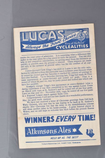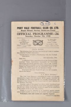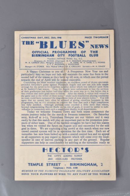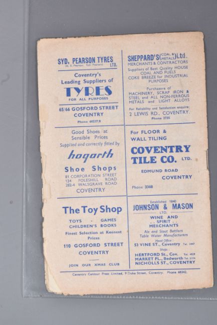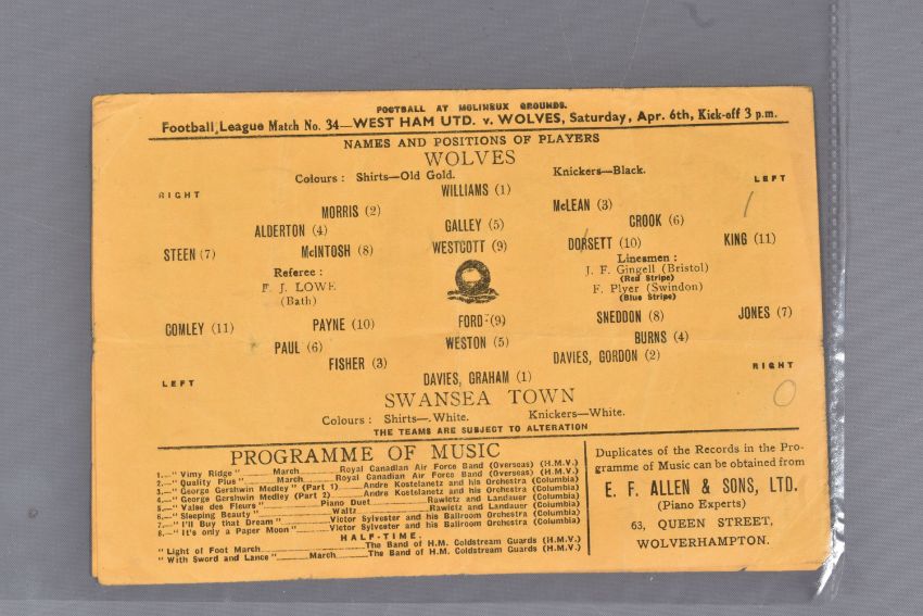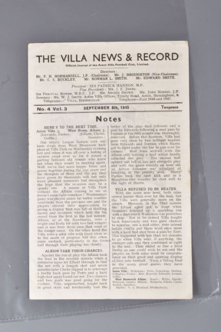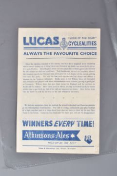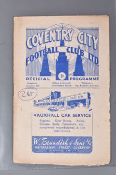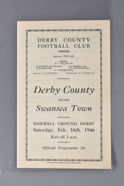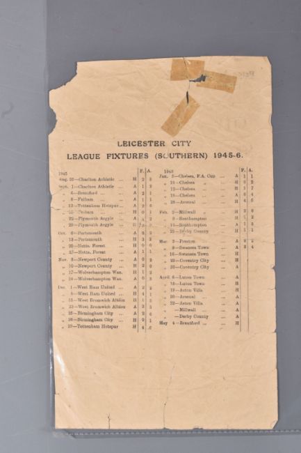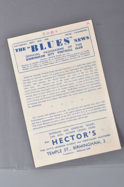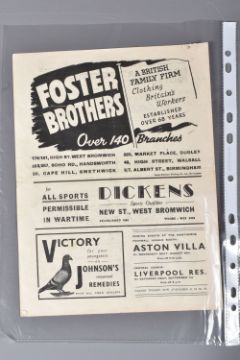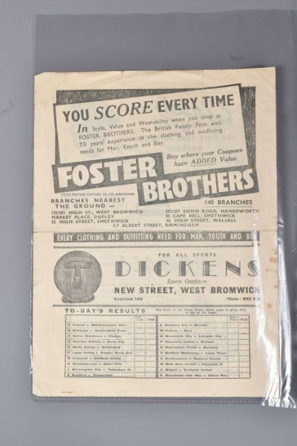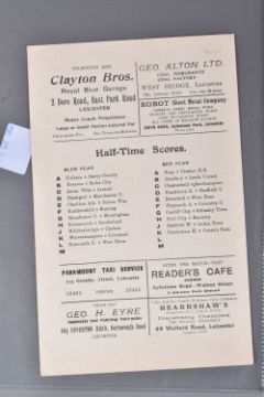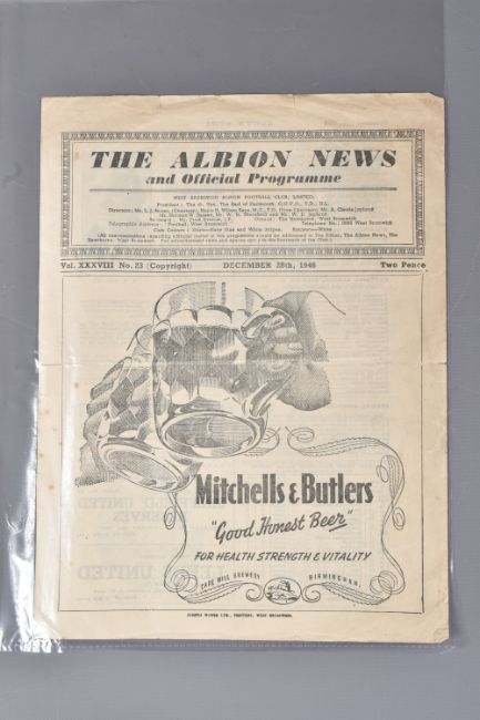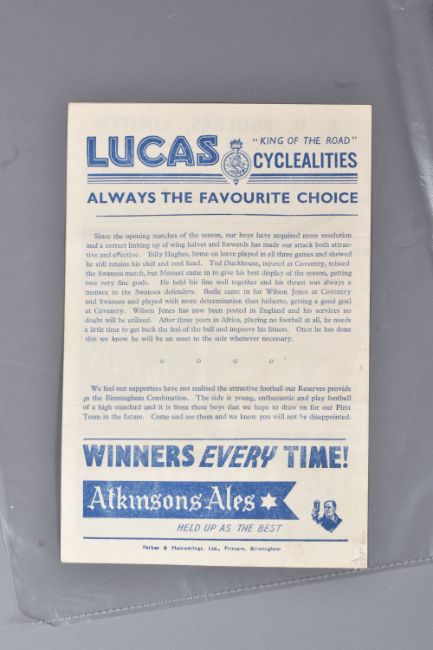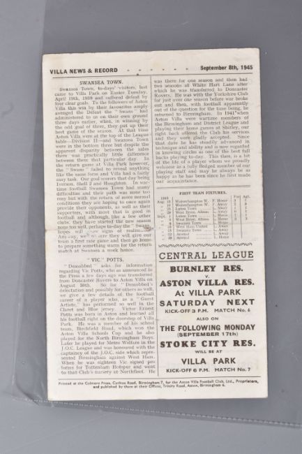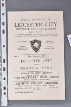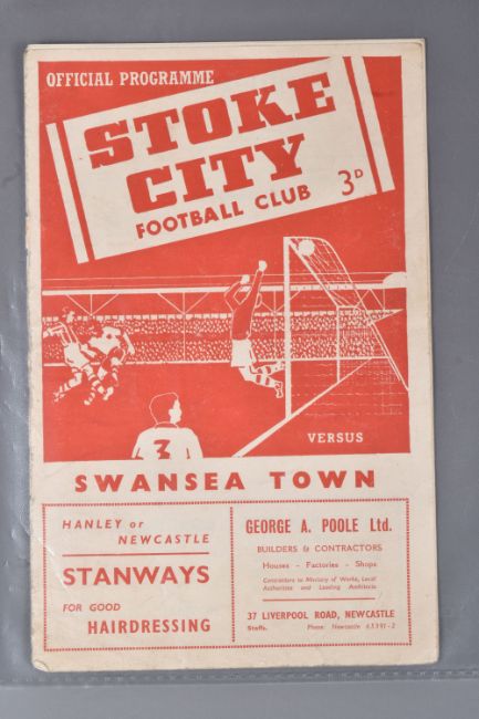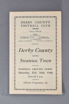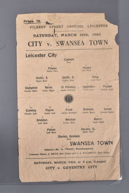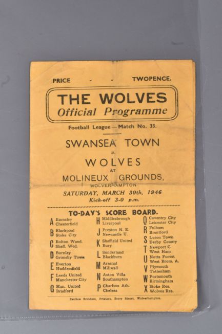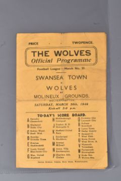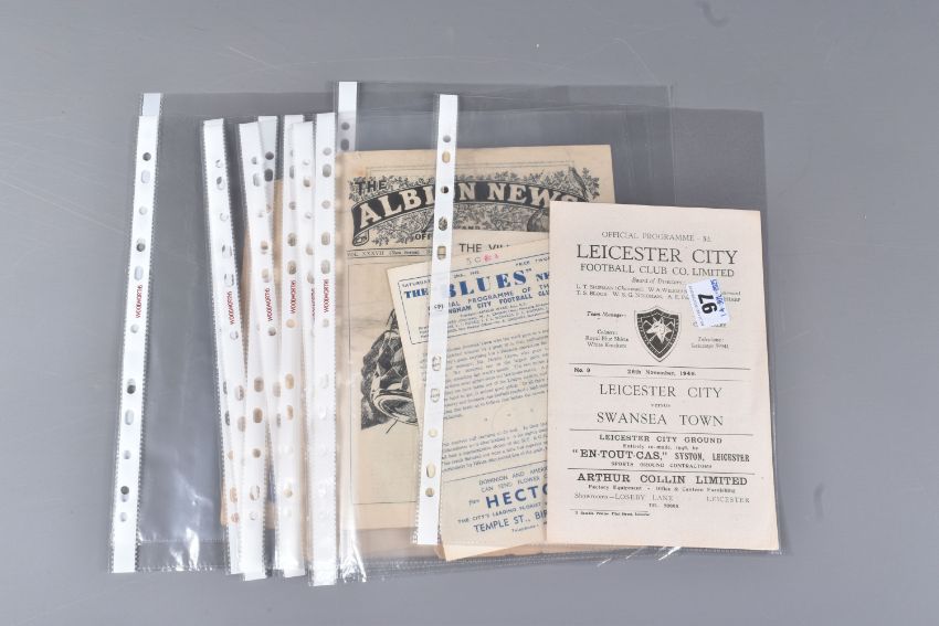 | TWELVE MID 20TH CENTURY FOOTBALL PROGRAMMES, all against Swansea, to include Leicester City 26th November 1949, Birmingham City 29th September 1945, Aston Villa News and Records September 8th 1945, West Bromich Albion August 25th 1945, Leicester City March 16th 1946, very worn, Wolverhampton Wanderers 30th March 1946, Birmingham City Christmas Day 25th December 1946, Albion December 28th 1946, Derby County February 16th 1946, Port Vale October 9th 1948, and Coventry City September 17th 1949, and Stoke city 13th November 1954, some with more wear than others, staining, folds or writing of players or scores |