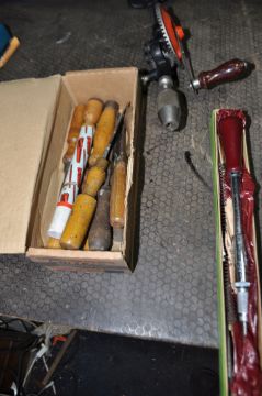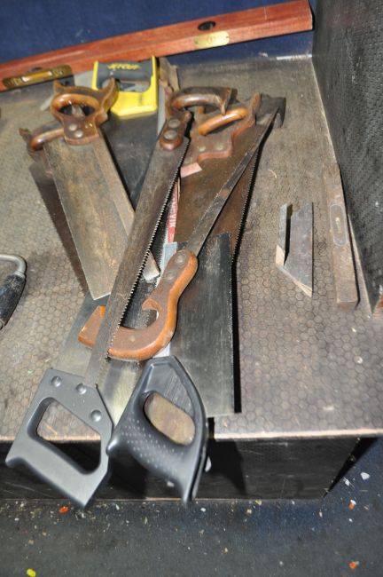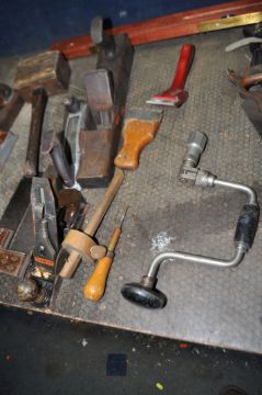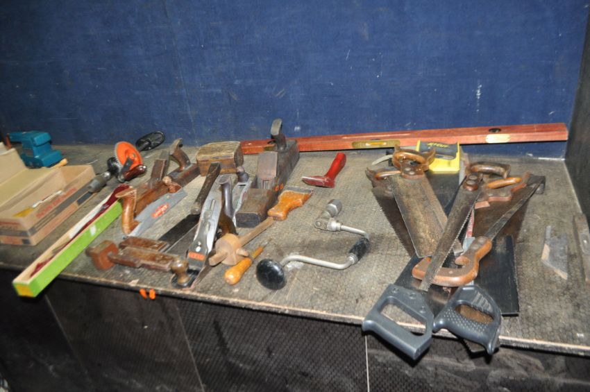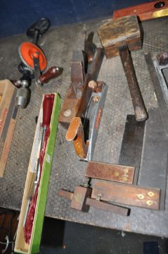A TRAY CONTAINING CARPENTRY TOOLS including a Record No442 10in hand brace, a Stanley No.902 shoulder brace, a Yankee screwdriver, a Stanley No.4 plane, two wooden planes, two tri squares, marking gauges, saws etc