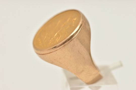 A GENTS YELLOW METAL HALF SOVEREIGN GOLD COIN SIGNET RING, collet set with a half sovereign, depicting Edward VII, dated 1906, Sydney Mint, approximate width 21.2mm, to a polished band stamped 9ct, ring size S, approximate gross weight 10.8 grams (condition report: general light wear, would benefit from a gentle clean)