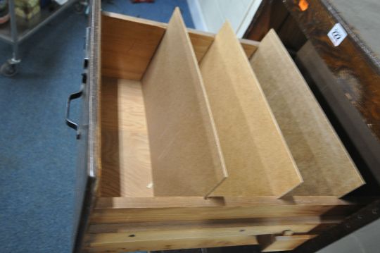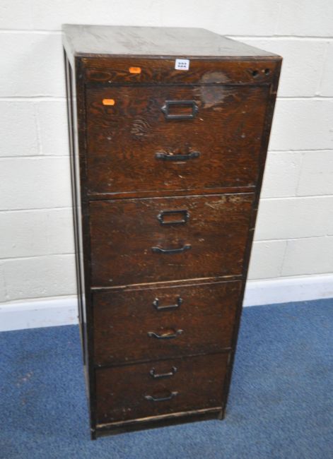 AN EARLY 20TH CENTURY OAK FOUR DRAWER FILING CABINET, width 51cm x depth 66cm x height 132cm, condition report: historical marks, scuffs, scratches, stains, discolouration, other wear and usage