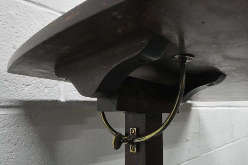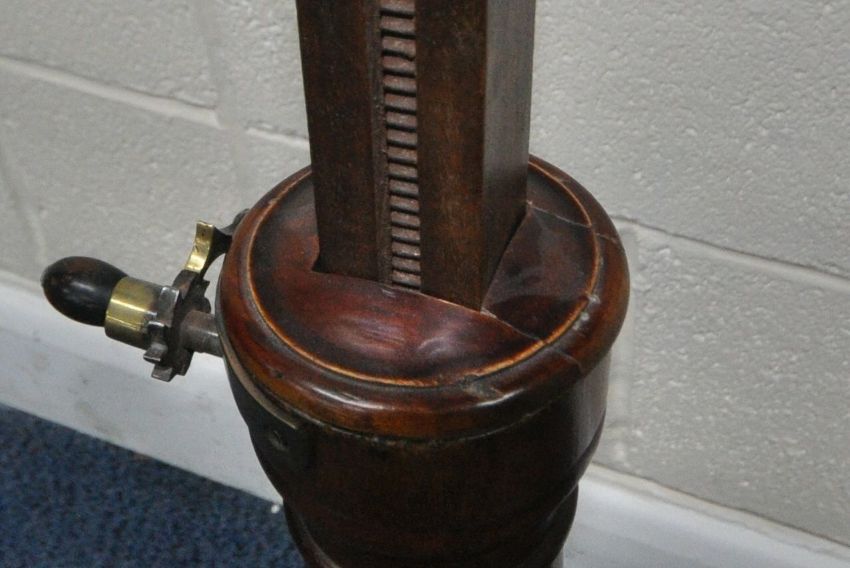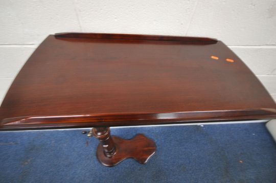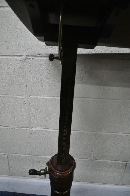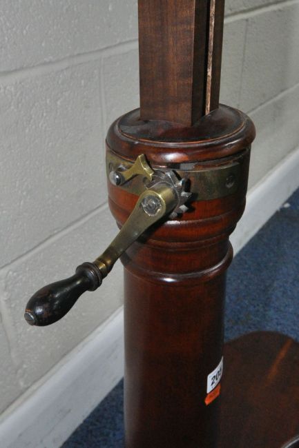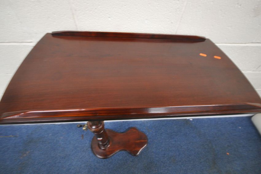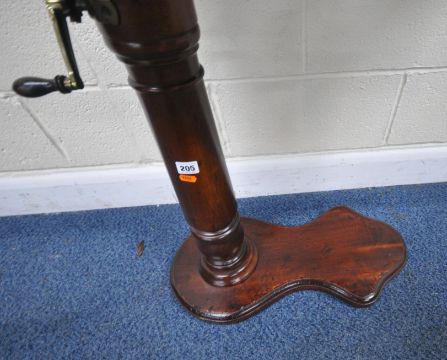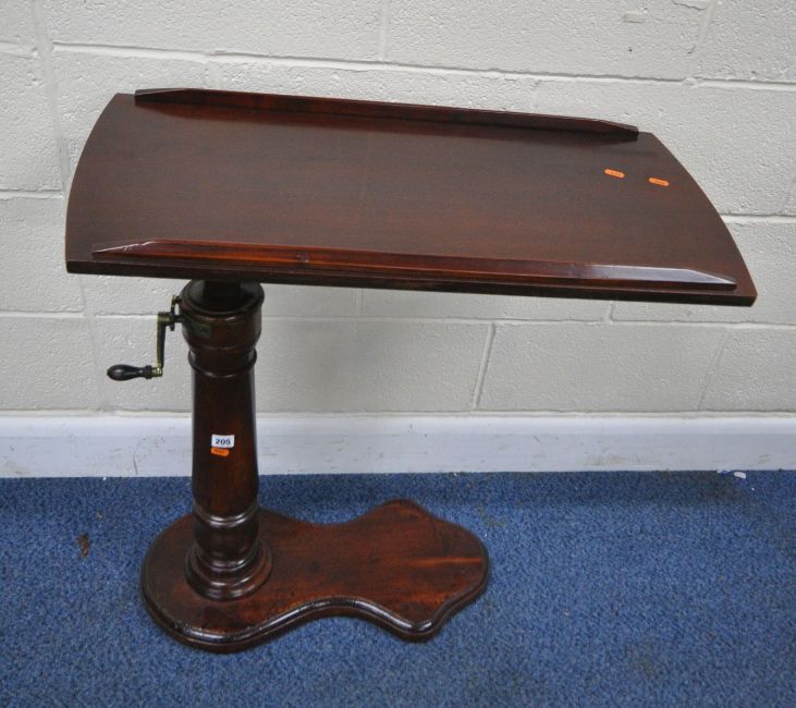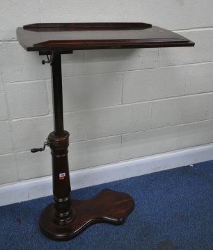 A VICTORIAN MAHOGANY READING TABLE, with a tilting surface, and a wind up mechanism, raised on a turned support and a shaped base, width 79cm x depth 40cm x minimum height 84cm x maximum height 117cm, condition report: mechanism working, general signs of wear and usage