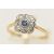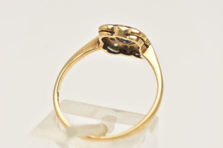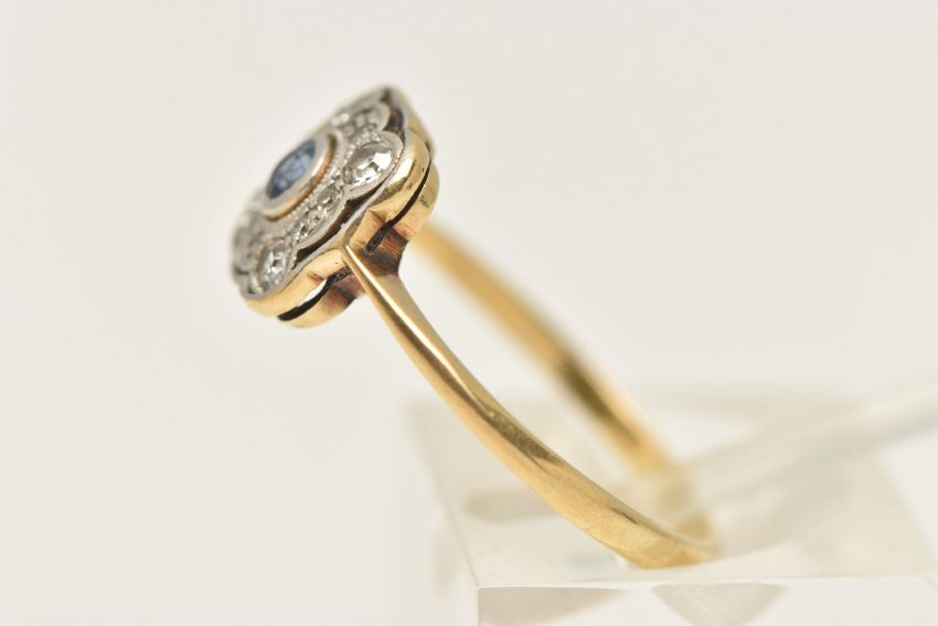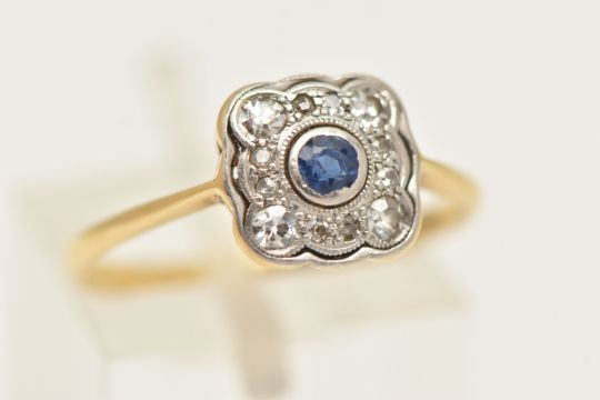 A SAPPHIRE AND DIAMOND CLUSTER RING, a square form white metal mount, bezel set with a principal circular cut sapphire, set with a surround of twelve single cut diamonds, leading on to a pinched shoulder yellow metal shank, stamped 18ct pt, ring size N, approximate gross weight 2.2 grams, (condition report: general moderate wear, overall condition good)