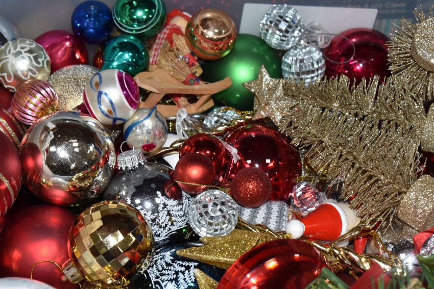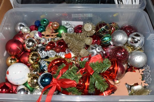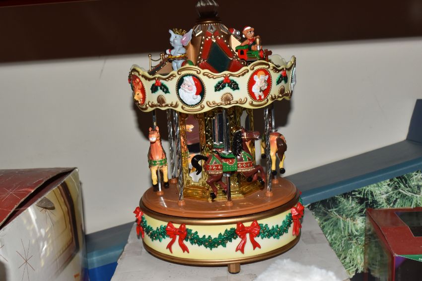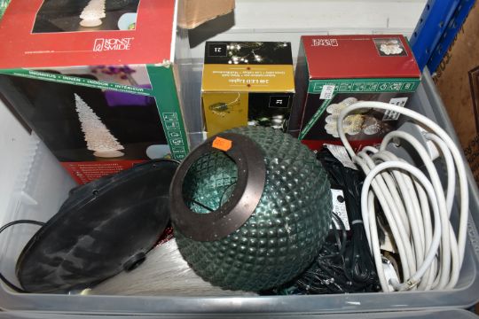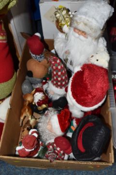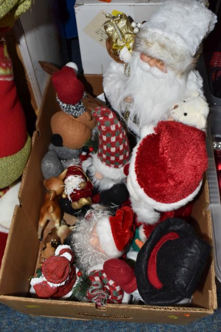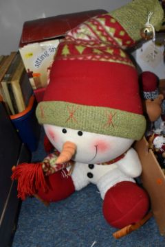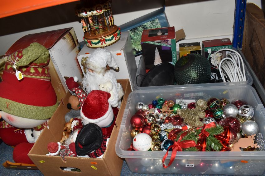 THREE BOXES AND LOOSE CHRISTMAS DECORATIONS, to include a boxed Sitting Snowman, height 56cm, a boxed carousel decoration, other freestanding figures of snowmen and Santa Claus, baubles including some vintage glass examples, lights, boxed tree, etc (3 boxes + loose) (sd, electricals untested)