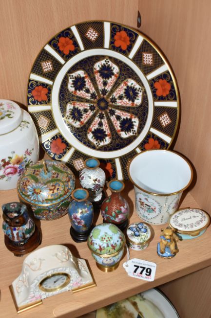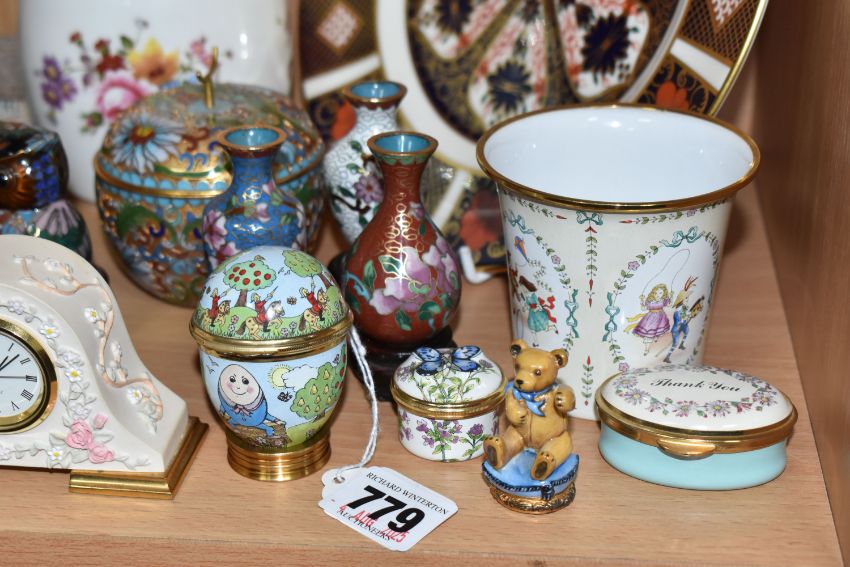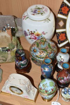 A COLLECTION OF DECORATIVE ITEMS to include a Royal Crown Derby '1128' Imari plate, diameter 21.5cm (some discolouration), a 'Derby Posies' ginger jar, three Lilliput Lane sculptures comprising 'Marigold Meadow,' 'Foxglove Fields,' and 'Kendal Tea House' (some rubs in places to all three), a group of five cloisonne items to include three miniature vases on wooden stands, a decorative owl, and a lidded pot, four enamel items comprising a Halcyon Days nursery beaker, s screw top butterfly pill box, and a Humpty Dumpty trinket egg, and a Staffordshire 'Thank You' trinket box, a miniature Teddy ornament, and a miniature mantel clock (qty) (Condition Report: itemised conditions above)
