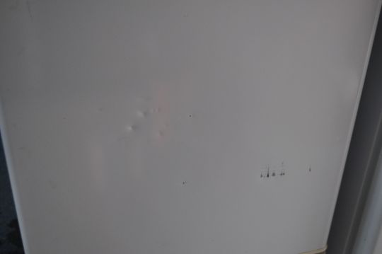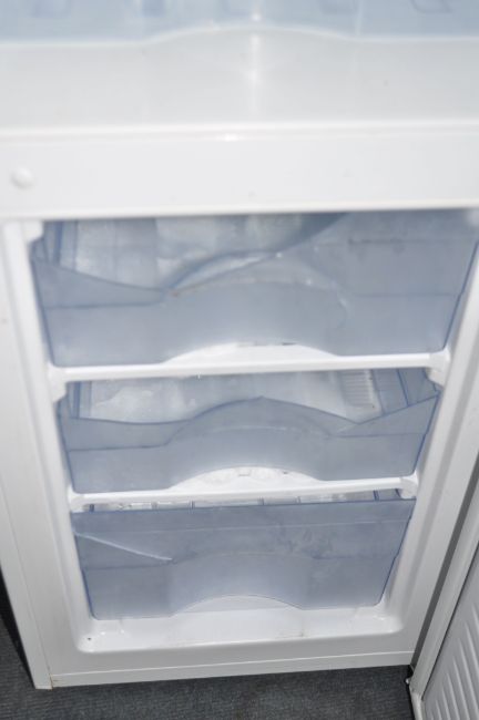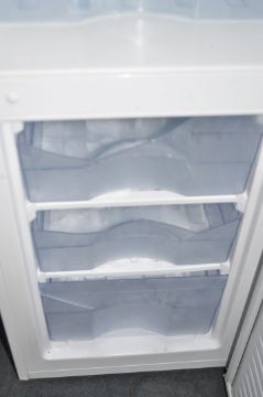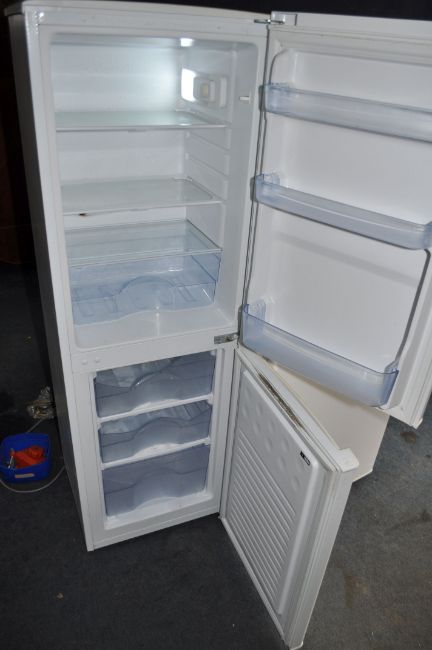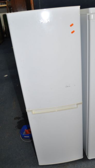 A SWAN SR8180W FRIDGE FREEZER width 50cm,d depth 50cm, height 144cm (PAT pass and working at 4 and -19 degrees). Condition Report: small dents to doors, all freezer drawers crack or missing pieces.