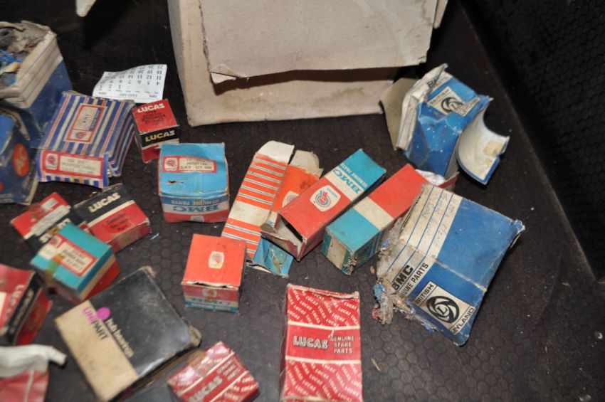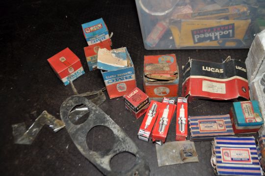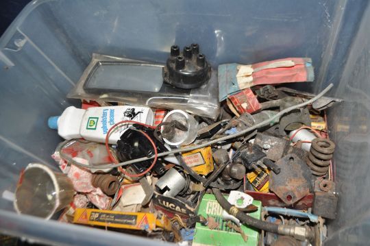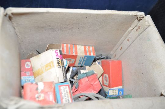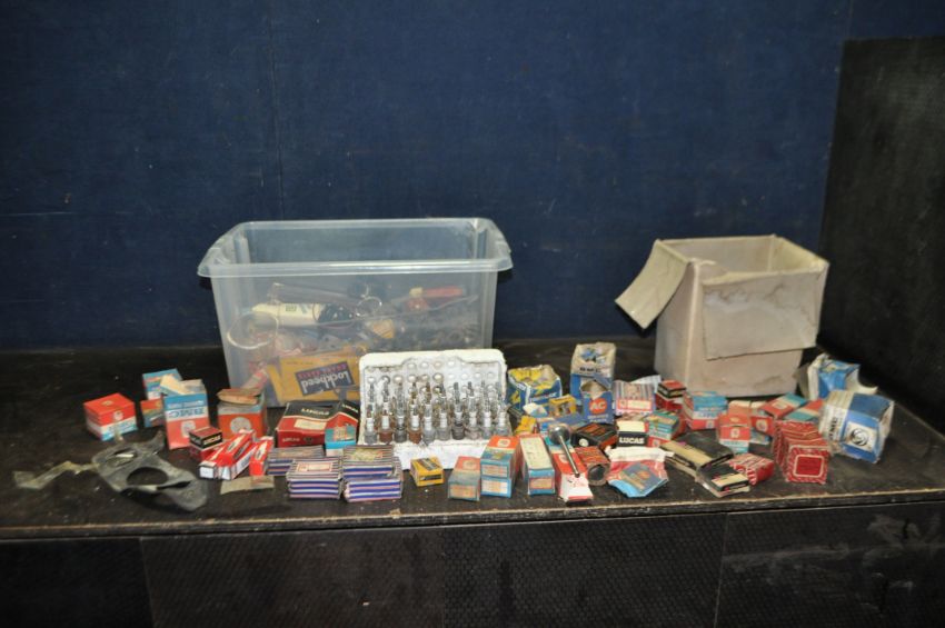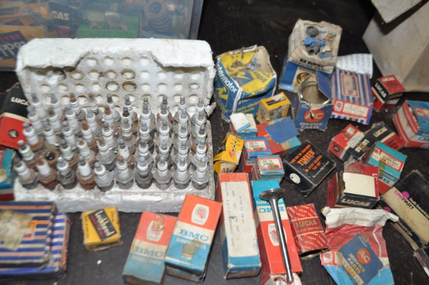 TWO BOXES OF MOSTLY NEW OLD STOCK, including BMC, Lucas, Lockheed, British Leyland such as Tappets, inlet and exhaust valves, valve rockers, bearings, spark plugs, etc