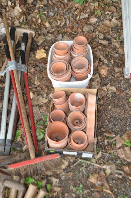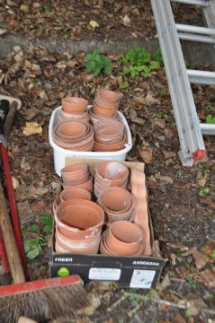 TWO TRAYS CONTAINING TERRACOTTA PLANT POTS, of varying sizes and ages