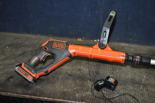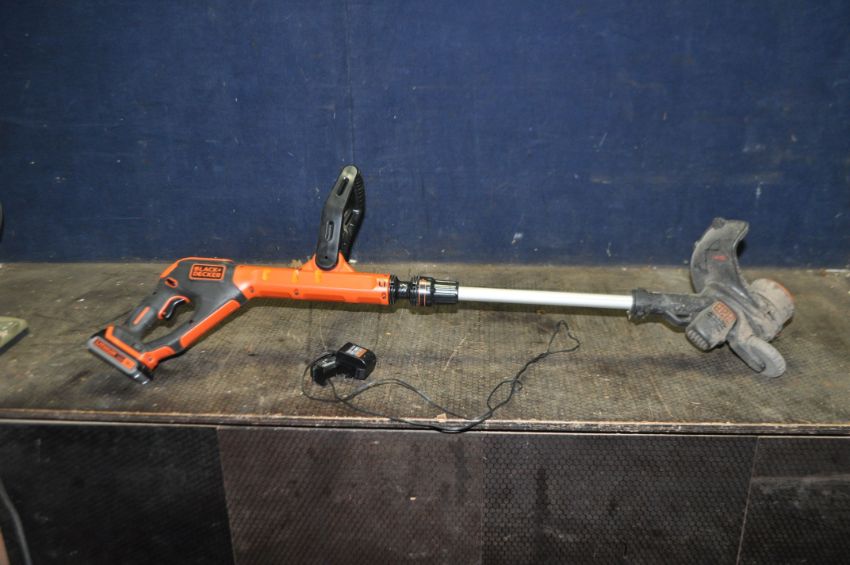 A BLACK AND DECKER 18V CORDLESS STRIMMER with one battery and charger (PAT pass and working but safety switch a bit intermittent)