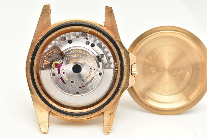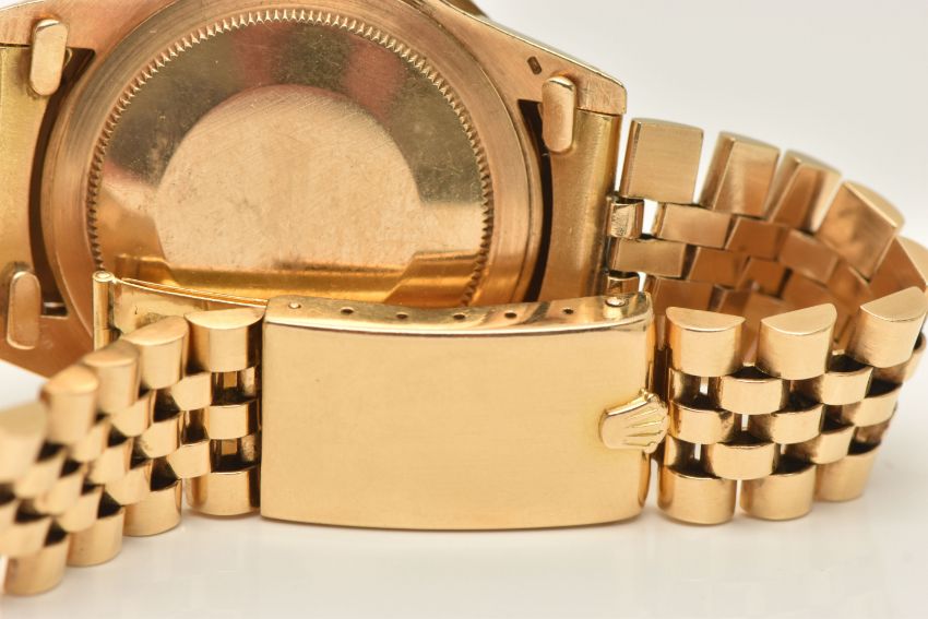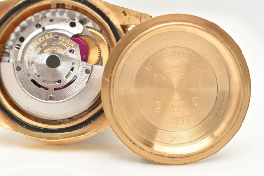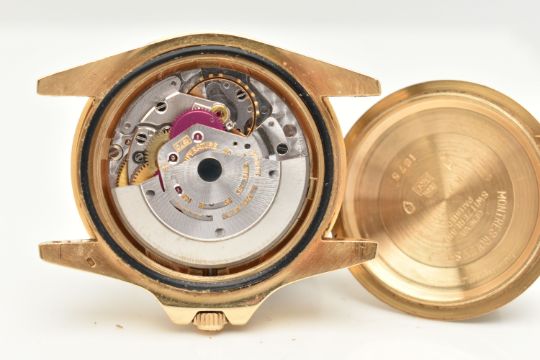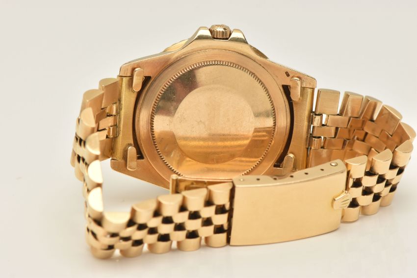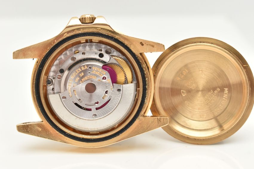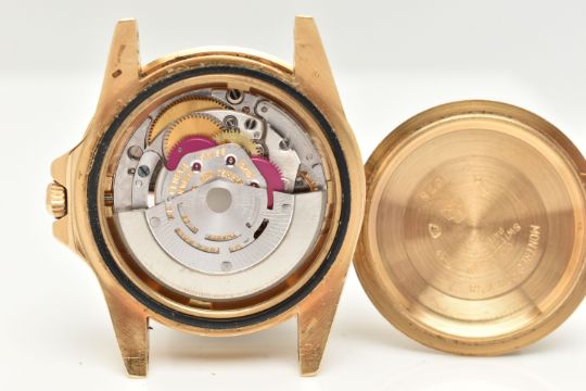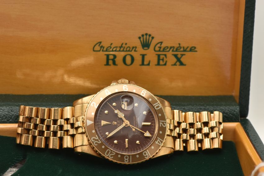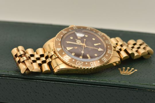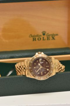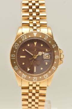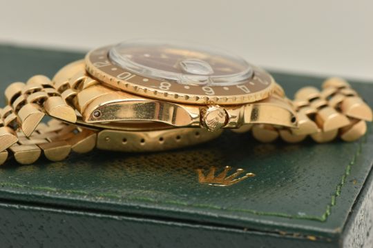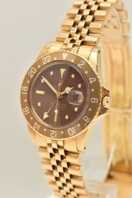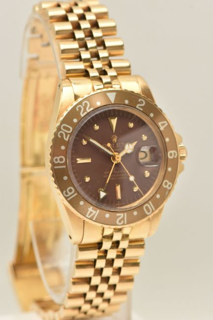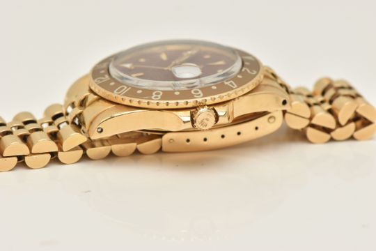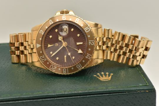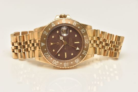 A 1974 YELLOW GOLD ROLEX OYSTER PERPETUAL GMT MASTER WRISTWATCH, model number 1675, believed to be Mark II non serif matte brown dial with nipple dot markers, bright white and gold Mercedes hands, cyclops lens and date marker to the three o'clock, plexiglass, gold coloured bezel insert, bezel currently not turning, stamped to the inside case back with Swiss control marks for 750, 18ct gold, matching 1675 model and 3656947 serial number, marked for previous movement servicing, calibre 1570, movement numbered D554838, fitted with an 18ct gold Jubilee bracelet, buckle and blade stamped 750, gross weight approximately 128.9 grams, with a Rolex box stamped 68.00.2, wooden lining (condition report: watch winds, all hands set from second position on crown and runs but accuracy not tested, can be wound from both crown and weight, some scratches to the glass and bezel, crown returns to case, play to links, watch has been opened and is not guaranteed to be water tight, bezel is turning, we cannot guarantee the working order of any watch)