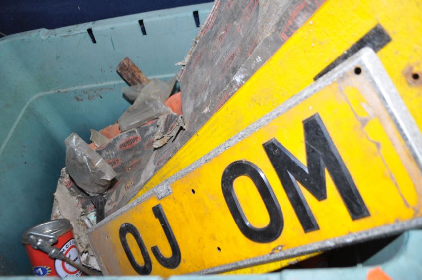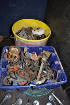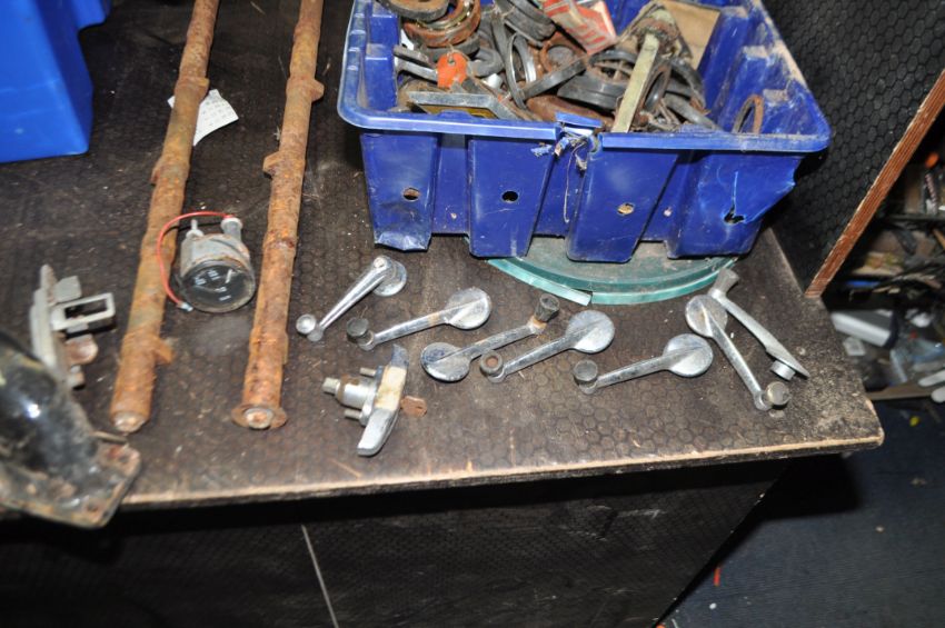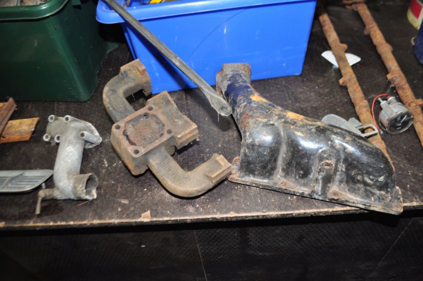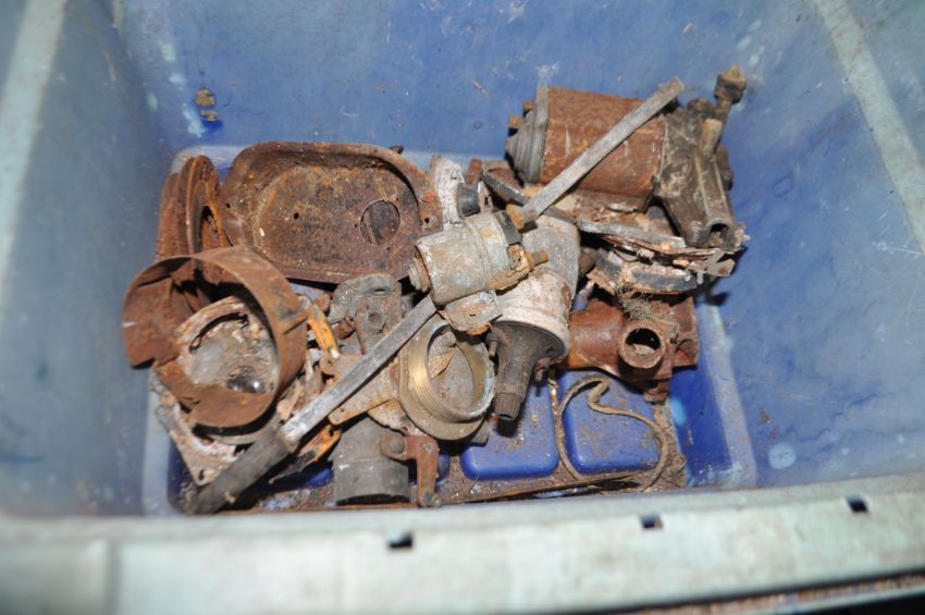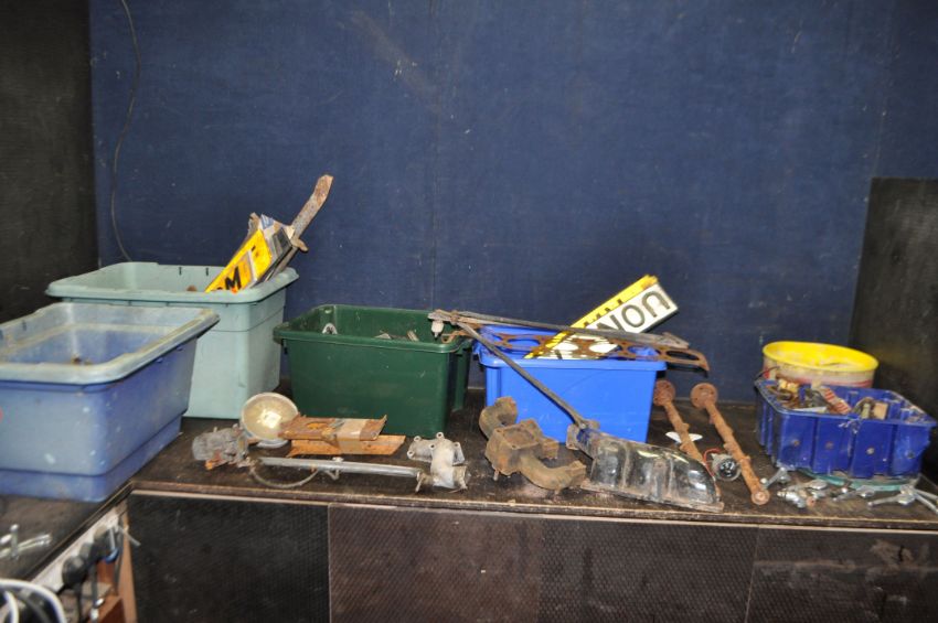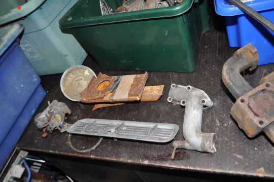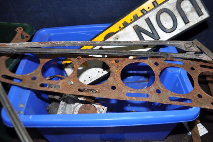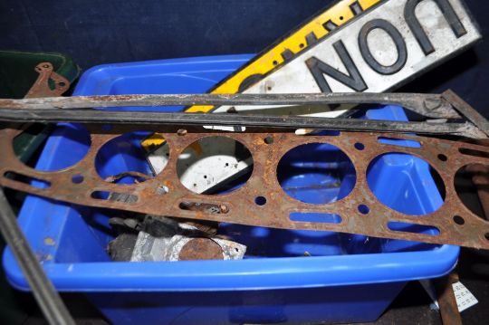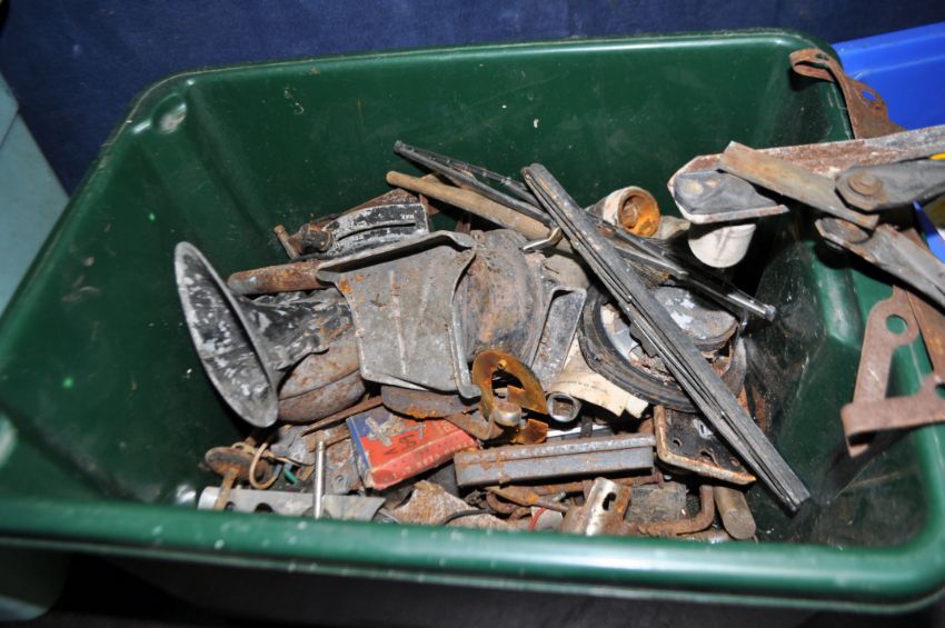 FIVE BOXES AND A TUB CONTAINING VINTAGE CAR PARTS, including a three port exhaust manifold, a four port Qualcast exhaust manifold, two cam shafts, a Solex carb, a Smiths speedo, horns, gaskets, door handles, oil seals, bearing, etc