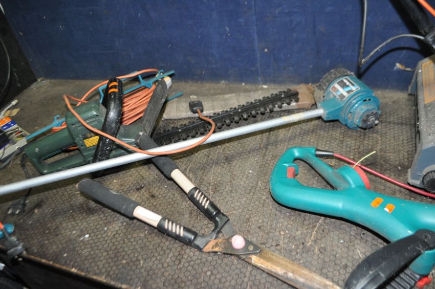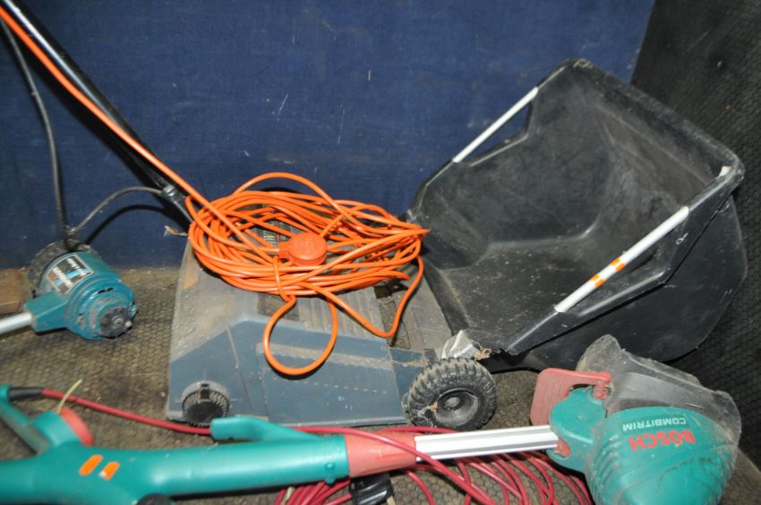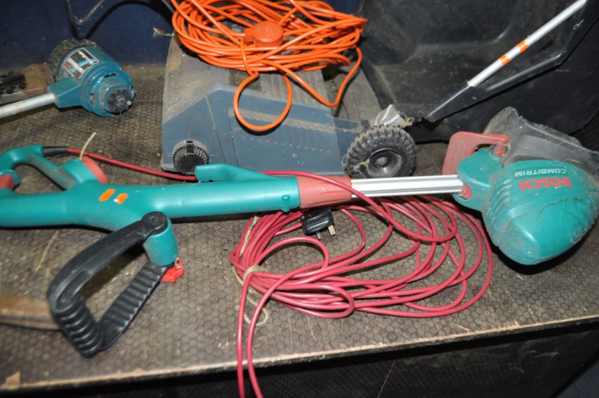 A COLLECTION OF GARDEN POWER TOOLS including a Bosch Combi trim strimmer, a Black and Decker Lawnraker (both PAT pass and working), a Black and Decker hedge trimmer and a patio cleaner (noisy and missing brush) (both PAT fail)