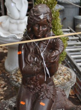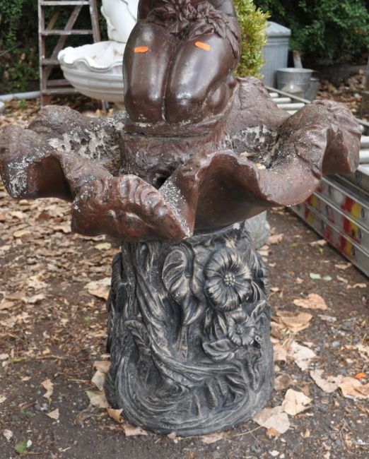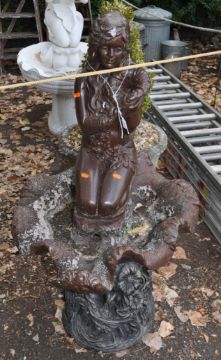 A MODERN CONCRETE GARDEN WATER FEATURE in the form of a maiden knelt in a shell, width 66cm x depth 71cm x height 124cm, condition report: weathered, paint flaking, top a different colour to the base, splits into three sections